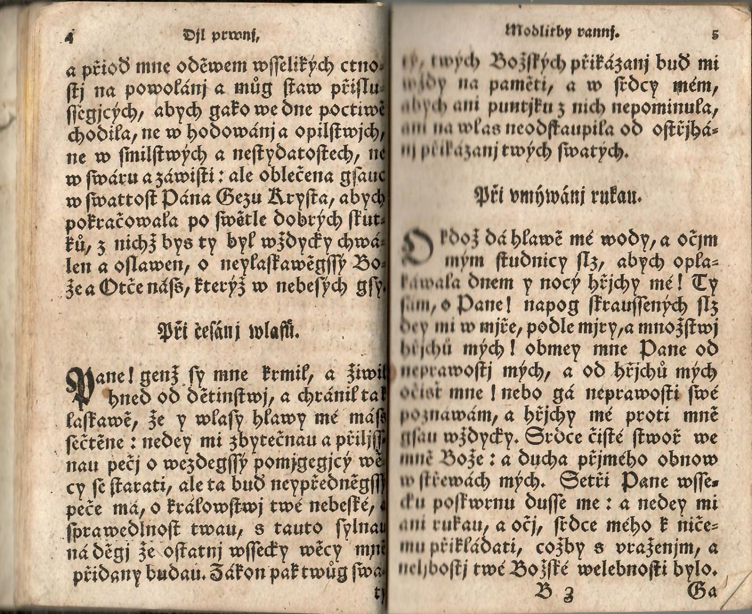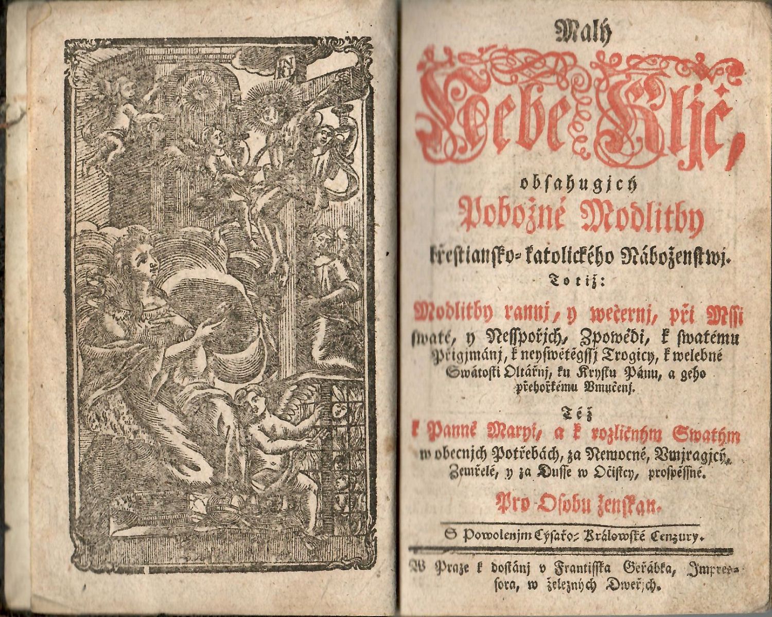 Malý Nebe Kljč, obsahugjcý Pobožné Modlitby křestiansko= katolického Náboženstwj, Totiž: Modlitby rannj, y wečernj, při Mssi swaté, y Nesspořjch, Zpowědi, k swatému Přigjmánj, k neyswětěgssj Trogicy, k welebné Swátosti Oltářnj, ku Krystu Pánu, a geho přehořkému Vmučenj. Též k Panně Maryi, a k rozličným Swatým w obecnjch Potřebách, za Nemocné, Vmjragjcý. Zemřelé, y za Dusse w Očistcy, prospěssné. Pro Osobu ženskau.