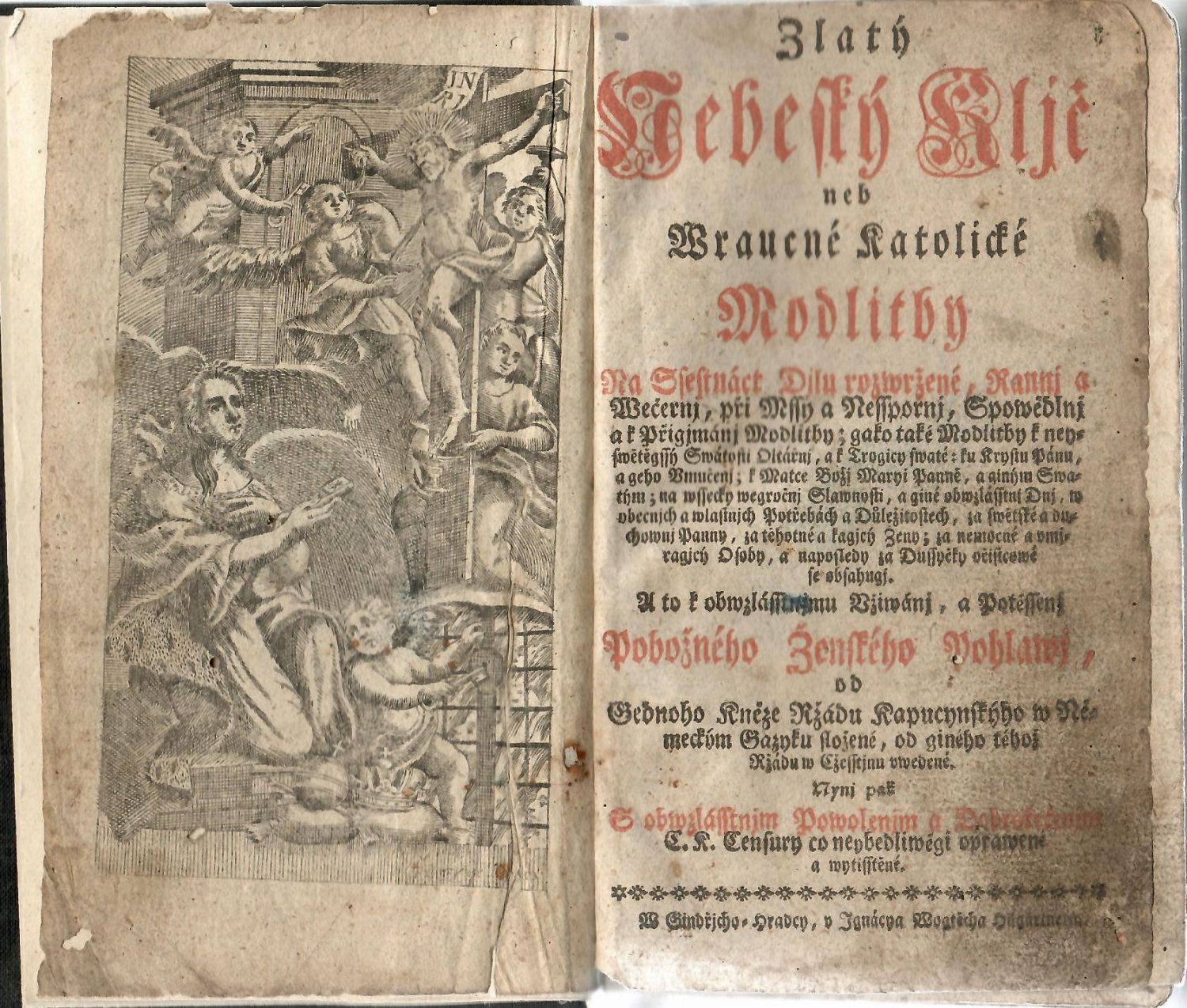 Zlatý Nebeský Kljč neb Wraucné Katolické Modlitby Na Ssectnáct Djlu rozwržené, Rannj a Wečernj, při Mssy a Nesspornj, Spowědlnj a k Přigjmánj Modlitby; gako také Modlitby k neyswětěgssý Swátosti Oltářnj, a k Trogicy swaté: ku Krystu Pánu, a geho Vmučenj; k Matce Božj Maryi Panně, a giným Swatým; na wssecky wegročnj Slawnosti, a giné obwzlásstnj Dnj, w obecných a wlastnjch Potřebách a Důležitostech, za Swětské a duchwnj Panny, za těhotné a kagjcý Ženy; za nemocné a vmjragjcý Osoby, a naposledy za Dussyčky očistcowé se obsahugj. A to k obwzlásstnjmu Vžiwánj, a P/otěssenj Pobožného Ženského Pohlawj, od .....