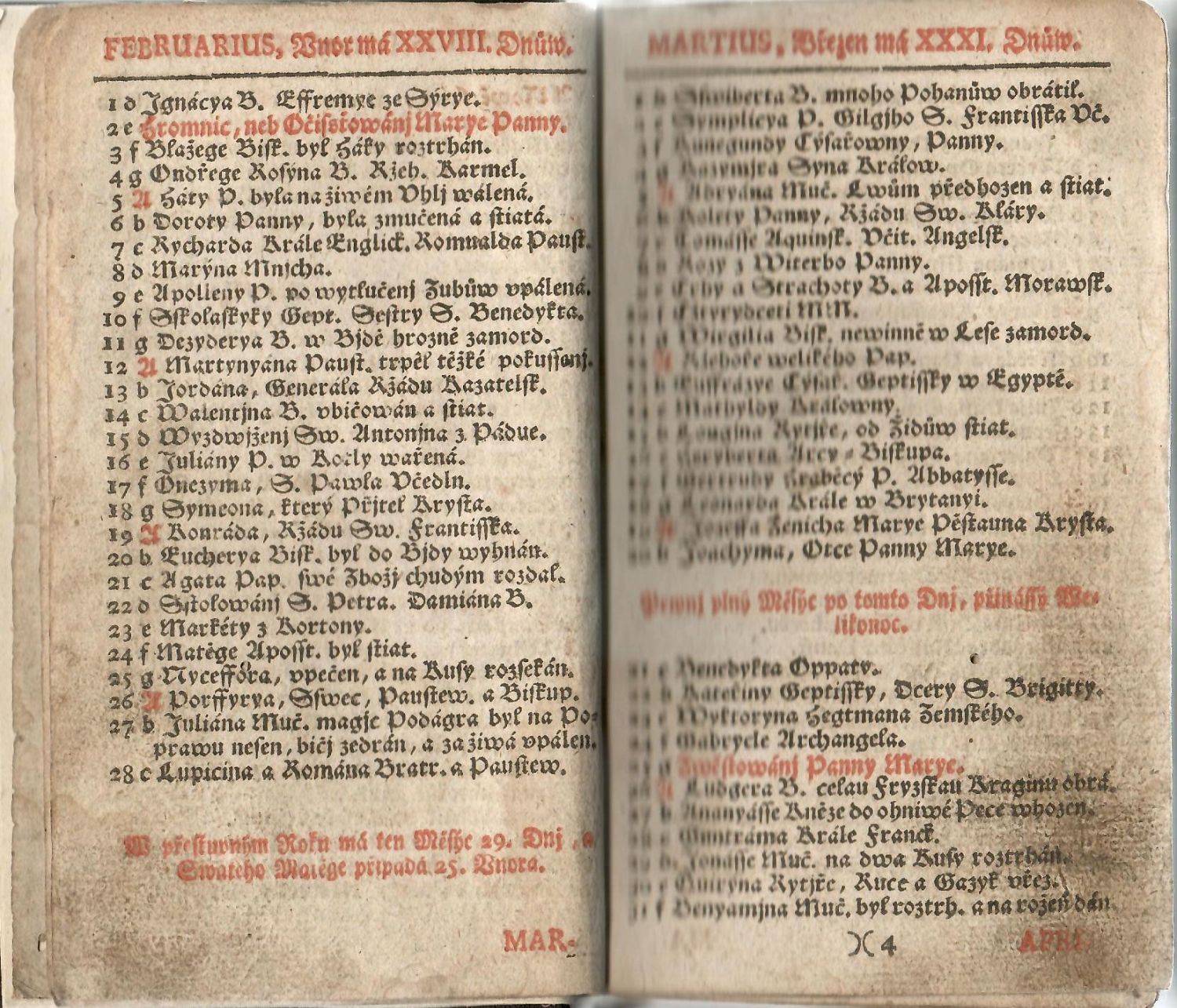 Knihopis 5314 (eviduje pouze 3 nekompletní ex.)<br>Tištěno gotikou, latinská slova antikvou, živá záhlaví od sazby oddělená jednoduchou linkou, signatury, stránkové kustody. Na straně 14 v záhlaví rokokový vlys s Božím okem mezi postavami dvou andílků, zdobené tyče a dvoulinky, koncové ozdůbky ze stylizovaných trojlístků, na straně 454 a 494 viněty s mušlí. Ve front. a v textu 14 původních celostr. mědirytin s různými náboženskými výjevy. Červeno-černě tištěný titulní list.<br>Nová vazba z černého plátna, ve hřbetu tlačený a zlacený název. Papír zahnědlý a místy zašpiněný, několik stran při vnějším okraji okousaných, několik při spodním okraji se stopami od čeervotoče, rytina ve front. zčásti podlepená, dvě v textu okousané po okraj plotny. Chybí poslední tři listy rejstříku, poslední dochovaný list rejstříku pomačkaný a zčásti utržený.