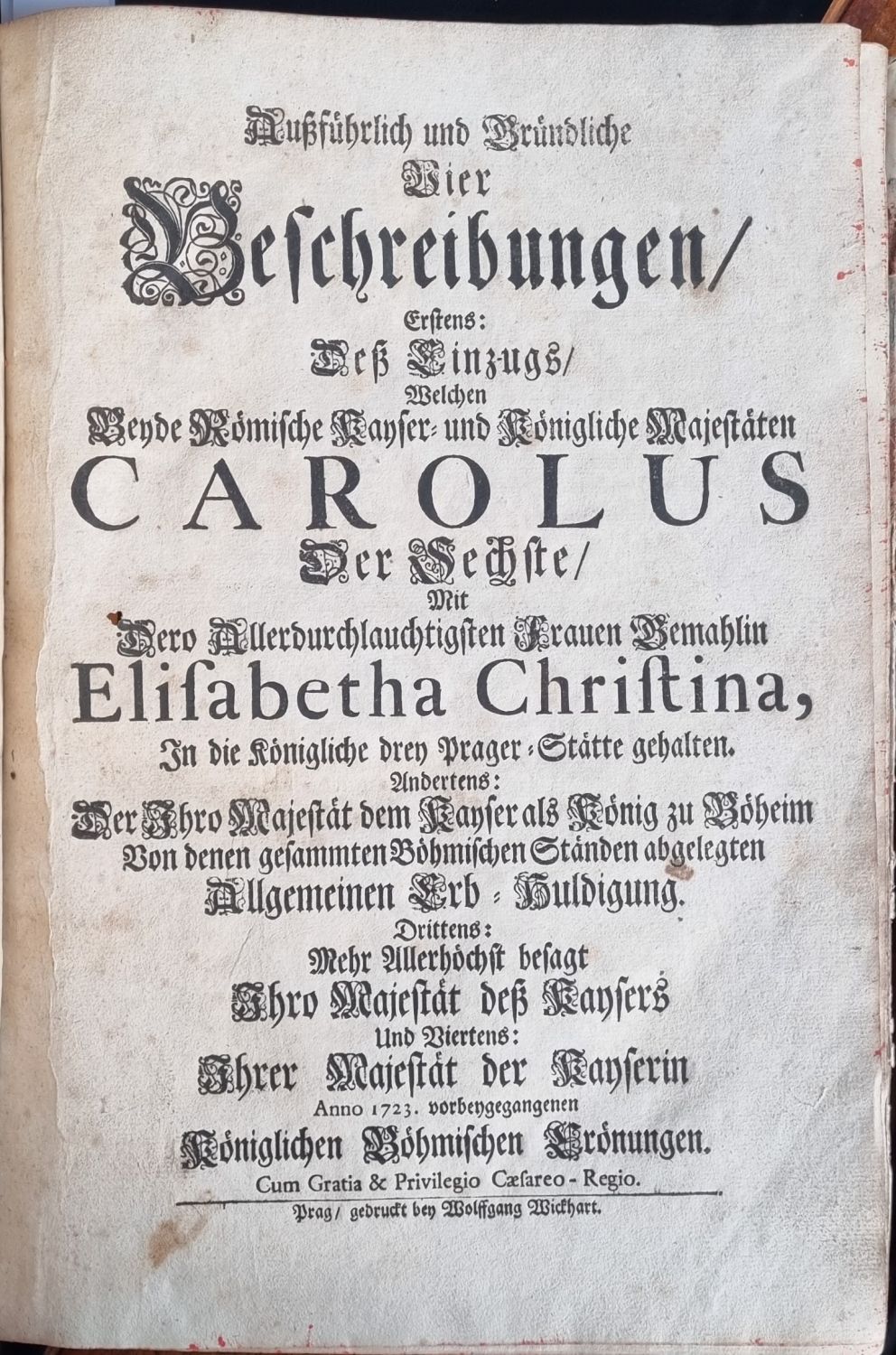 Außführlich und Gründliche Vier Beschreibungen, Erstens: Deß Einzugs, Welchen beyde Römische Kayser = und Königliche Majestaten CAROLUS Der Sechste, Mit Dero Allerdurchlauchtigsten Frauen Gemahlin Elisabetha Christina, In die Königliche drey Prager=Stätte gehalten. Andrtens: Der Ihro Majestät dem Kayser als König zu Böheim Von denen gesammten Böhmischen Ständen abgelegten Allgemeinen Erb = Huldigung. Drittens: Mehr Allerhöchst besagt Ihro Majestät deß Kaysers Und Viertens: Ihrer Majestät der Kayserin Anno 1723. vorbeygegangenen Königlichen Böhmischen Crönungen.