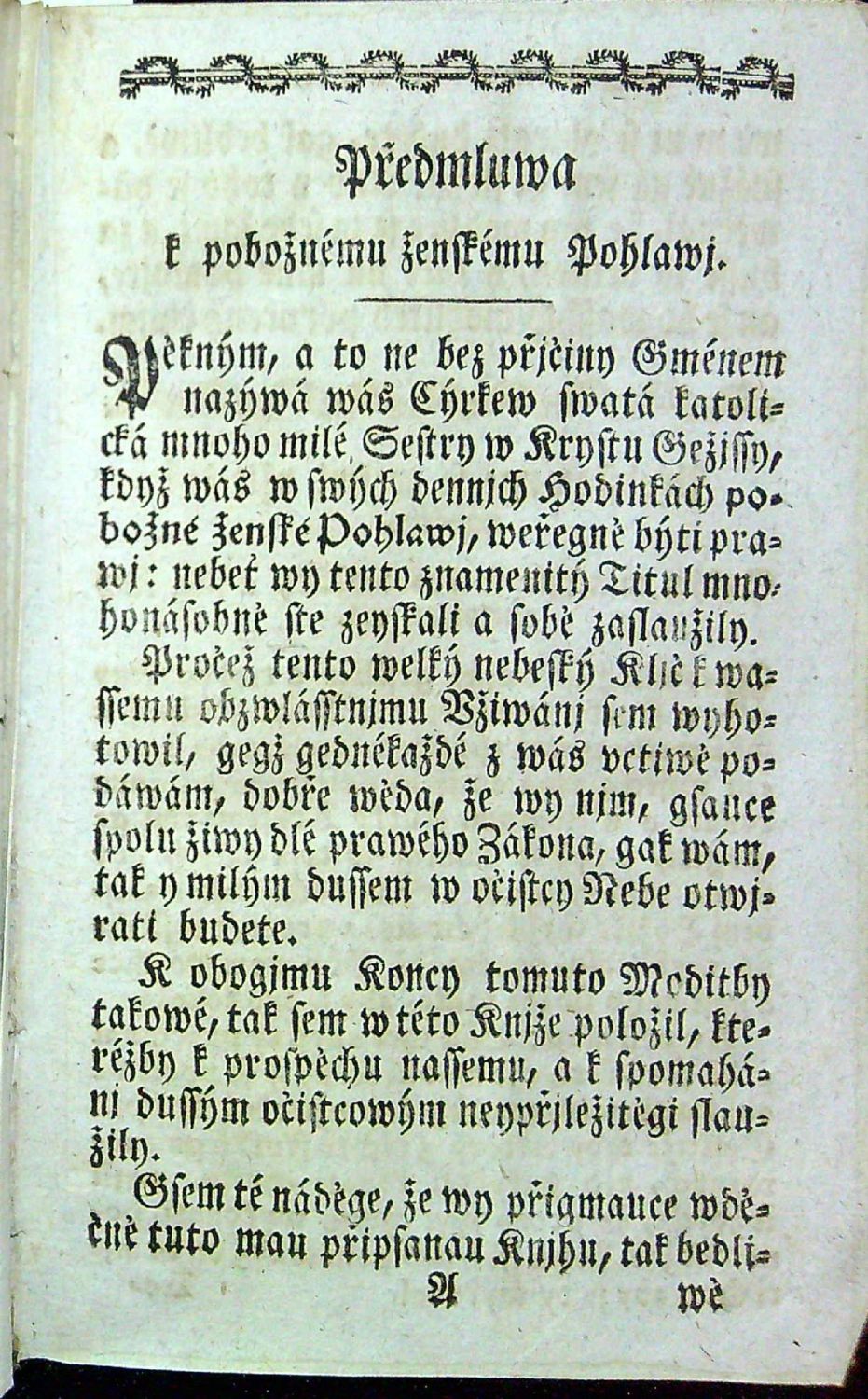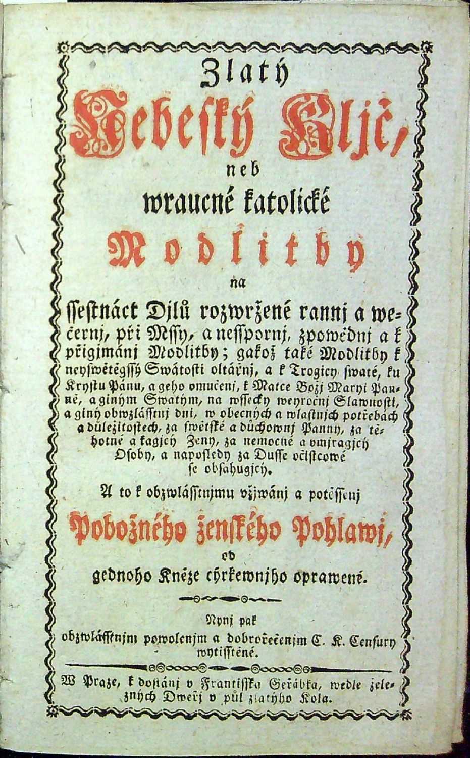 Zlatý Nebeský Kljč neb wraucné katolické Modlitby Na ssectnáct Djlu rozwržené rannj a wečernj, při Mssy, a nesspornj, zpowědlnj a k přigjmánj Modlitby; gako také Modlitby k neyswětěgssý Swátosti oltářnj, a k Trogicy swaté, ku Krystu Pánu, a geho vmučenj, k Matce Božj Maryi Panně, a giným Swatým, na wssecky weyročnj Slawnosti, a giný obwzlásstnj dni, w obecných a wlastnjch potřebách a důležitostech, za swětské a duchwnj Panny, za těhotné a kagjcý Ženy, za nemocné a vmjragjcý Osoby, a naposledy za Dusse očistcowé se obsahugjcý. A to k obwzlásstnjmu vžiwánj a potěssenj Pobožného ženského Pohlawj, od gednoho Kněze cýrkewnjho oprawené.