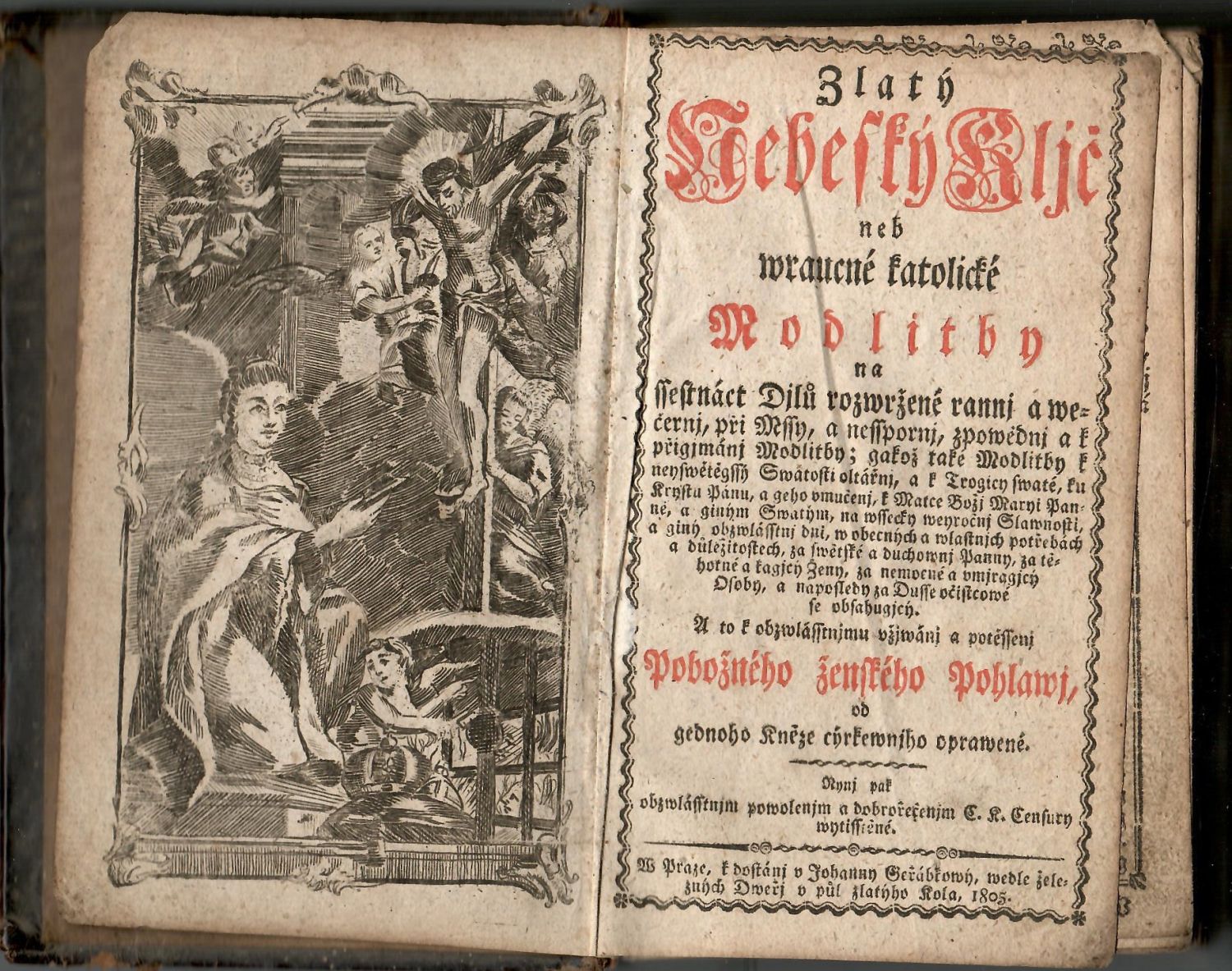 Zlatý Nebeský Kljč neb wraucné katolické Modlitby na ssestnáct Djlů rozwržené rannj a wečernj, při Mssy, a nesspornj, zpowědnj a k přigjmánj Modlitby; gakož také Modlitby k neyswětěgssý Swátosti oltářnj, a k Trogicy swaté, ku Krystu Pánu, a geho vmučenj, k Matce Maryi Panně, a giným Swatým, na wssecky weyročnj Slawnosti, a giný obzwlásstnj dni, w obecných a wlastnjch potřebách a důležitostech, za swětské a duchownj Panny, za těhotné a kagjcý Ženy, za nemocné a vmjragjcý Osoby, a naposledy za Dusse očistcowé se obsahugjcý. A to k obzwlásstnjmu vžjwánj a potěssenj Pobožného ženského Pohlawj, od gednoho Kněze cýrkewnjho oprawené.