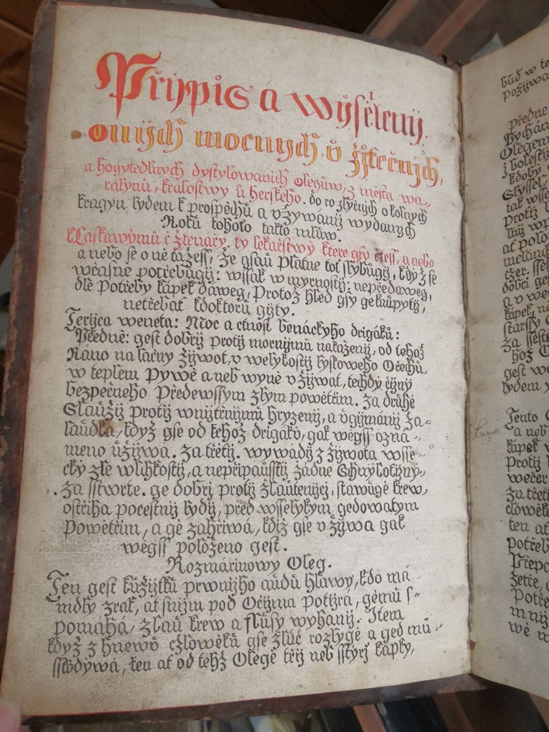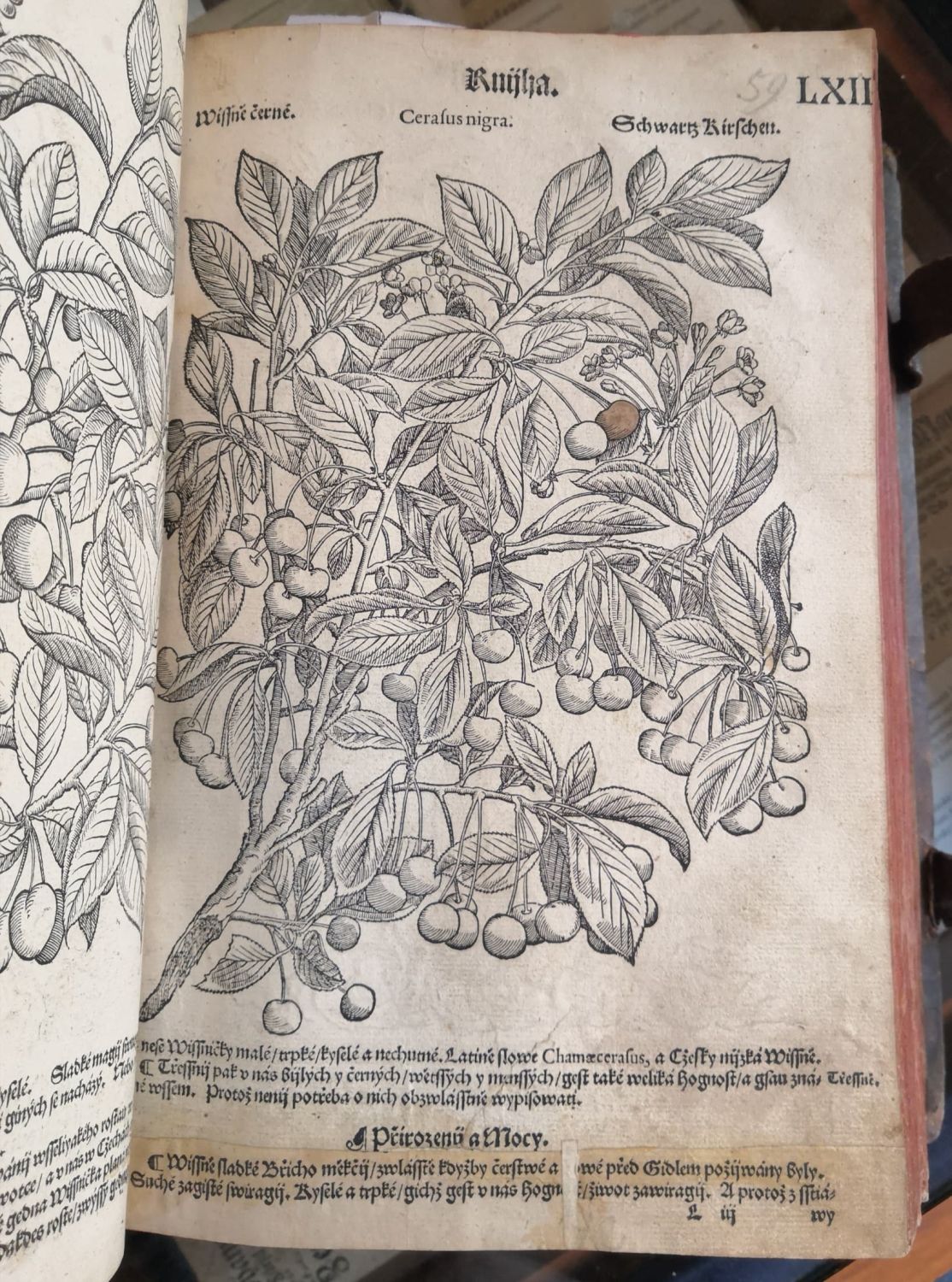 Knihopis 5416; Graesse IV, str. 446-447; Nissen 1314; Rukověť II, str. 247-8<br>Gotické písmo, latinský text antikvou, červeno-černě tištěný titulní list, římská foliace při horním vnějším okraji, tištěné poznámky po stranách, živá záhlaví, v textu pěti a šesticípé hvězdičky, žaludy, ukazující ručičky a větévky. - Nezdobená hnědá barokní vazba cca z poloviny 18. století s párem spon na kožených úchytech, červeně barvená ořízka, knižní blok oříznutý. Vazba odřená, horní okraj hřbetu natržený. - Chybí fol. *6, ***1, ****1-4 (erby českých pánů - protektorů herbáře), fol. 13 (C1), 48 (h5), 258 (T6), fol. Sss3 (s dřevořezem destilačního přístroje) a 12 posledních listů s indexem lékařství per extensum a opakovaným erbem Melantricha (tyto jsou nahrazeny opisem). Fol. 174-175 oříznuté a podlepené, fol. 185 přelepené, fol. 191-195 zčásti utržené, fol. 218, 222, 227 natržené, fol. 255 torsovité, fol. 263 a 270 zčásti utržené, fol. 271 rkp. opis, fol. 272 zčásti utržené, fol. 275 v opisu, fol. 325 natržené, fol. 326 s odtrženým spodním okrajem a dopsaným textem, fol. 327-330, 335 a 336 s utrženými a částečně dolepenými dolními rohy, fol. 337 torsovité, fol. 347 v opisu, fol. 379, 384, 385, 388, 390, 391 (toto vprostřed protržené), 392 a poslední nečíslované listy obsahující "Krátkou zpráwu o rozličném Dysytlowánij" a rejstříky s přelepnými okraji.<br>Významný lékař P. Mattioli vydal svůj Herbář poprvé italsky v Benátkách roku 1544. Od roku 1554 pobýval v Praze jako lékař arciknížete Ferdinanda Tyrolského a později i císaře Maximiliána II. Toto postavení podpořené finanční dotací panovníka, české šlechty i staroměstské obce umožnilo Tadeáši Hájkovi z Hájku (asi 1525 - 1600) přeložit Herbář do češtiny, rozšířit o vlastní poznatky a vydat dílo v českém jazyce roku 1562 u Jiřího Melantricha z Aventýnu. Toto vydání neznamená pouze převrat v české botanické vědě (a zejména v názvosloví), ale přináší také nové prvky do ilustrační výzdoby spisů tohoto druhu. Štočky těchto ilustrací však Mattioli po dokončení tisku odvezl z Prahy. Roku 1586 vyšla ve Frankfurtu nová německá úprava Herbáře Joachima Cameraria (Kammermeister, 1534 - 1598) doplněná ilustracemi Konráda Gesnera. Daniel Adam z Veleslavína společně s Adamem Huberem tuto knihu přeložil a roku 1596 ji podruhé v Praze vydal.<br> Před vlastní knihou je vevázaný rukopis z 18. století "Přypis a wyselenij [správně wyswětlenij] onijch mocnych užitečnjch, a hogytedlnych dystylowanich oleqůw, z mesta warasynů, kralowstwy ůherskeho do rozličnjch okolnych kragyu lydem k prospěchů a wzywanij wydanych Roků tohoto takto mlůw. Laskawýmů čžtenářy ty lékařstwý které gsy čtess, a nebo a nebo se o ně tážess, že gsaů platne toť slybůgij, kdýž se wčasně potřebugij: wssak w myrnostij: nepředaweg, dle Potřeby kápek dáweg, Protož hled gsy ge kaůpytij, netřebat k doktorů gijty".<br>16 listů, z toho třicet kaligrafickým písmem popsaných stran černým, místy červeným inkoustem. V textu jsou popsány různé druhy olejů a jejich hojivé účinky, dále různé masti a jejich vhodné použití, rady ohledně hovězího dobytka (mnohdy velmi kuriozní), seznam nešťastných dnů v roce a doporučení, čeho se v ty dny vyvarovat, návod pro výrobu různých inkoustů, pojednání o lidském těle a rady, jak zdravě žíti a jak vysokého věku se dožíti. Na listu 12a mezititul: "PředPis Swědků. a Swedeztwij, Ssesnástij, doktorů. Tohoto werbáře swýkůramij. Aneb třycýtij swědku bez owěg(r)ky, zde. Na rubu listu pokračování textu z listu předchozího. Text pokračuje radami co dělat, když do ucha vleze škvor, postříká-li ho jedovatá žába, ještěrka. V závěru stručný návod, jak připravovat různé oleje. Na konci na rubu listu 15 seznam Svědků všech doktorů stavu rytířského: Wolf z Wřesovic, Burán Trčka z Lípy, Vilém Muchek z Bukova, Voldřich Dubanský z Dubán, Jan Léskovec z Leskovce, Oswald z Šenfeldu, Jaroslav Smiřický ze Smiřic, Bernard Žehusický z Rychmurka, Šťastný Křinecký z Ronova, ? z Lobkovic. Na listu 16a seznam stavů: Bořita z Martinic, Adam ze Švamberka, Jiří Vchynský ze Vchynic, Jan z Valdštejna, Joachim z Hradce, Zdeněk Malovec z Malovic, Zbyněk Berka z Dubé, Jan starší z Lobkovic, Joachim Šlik a dále Taseáš Hájek z Hájku. V Národním lékařském domě je uchováno torso jiného rukopisu podobného jména (pouze 6 listů), kde je na titulním listu uvedeno vytištěno ve Warasínu roku 1765. Dle srovnání se zdá rukopis předvázaný v nabízeném herbáři starší.<br>Barokní kožená vazba z 18. století s tlačeným zrcadlem na obou deskách, na přední desce dva kovové trny, dvě kožené přezky s kovovými úchyty dochovány. Vazba odřená. červeně barvené ořízky. Za rejstříkem rkp. v českém jazyce z 19. století s různými recepty.<r> Warasín (Varaždín či Varadín), dnes Oradea v Rumunsku, dříve součást Uherského království.