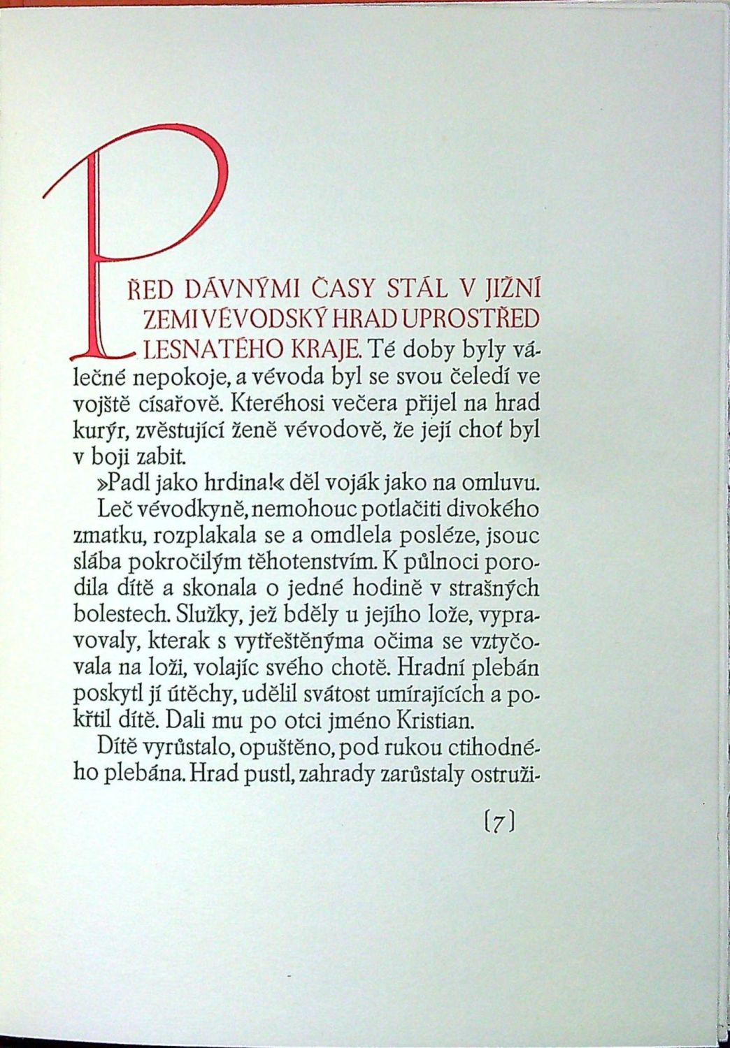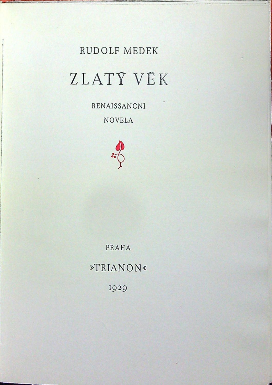 Ex. č. 17 z 25 výtisků tištěných střední Malostranskou antikvou na pravý japan, vytiskla Státní tiskárna v Praze za vedení Karla Dyrynka. Červeně tištěné vinětky a vstupní iniciála s počátkem textu tištěného červeně versálkami. <br>Původní kartonová vazba potažená červeně barveným škrobovým papírem s chlopněmi (původní adjustace), původní kartonové ochranně pouzdro. Na patitulu podpis Medkův černým perem. Volně vložen fotograficky portrét Medkův od architekta Jana Vaňka s Medkovým podpisem.