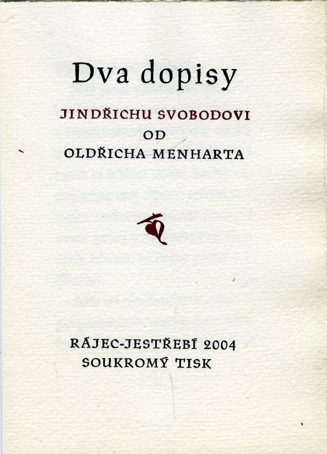 Soukromý tisk k nedožitým 95. narozeninám mistra knihaře, prof. Jindřicha Svobody. Písmem Manuscript vysázel a na losínský papír 22 výt. na ručním lisu vytiskl J. Juránek. - Intaktní stav.
