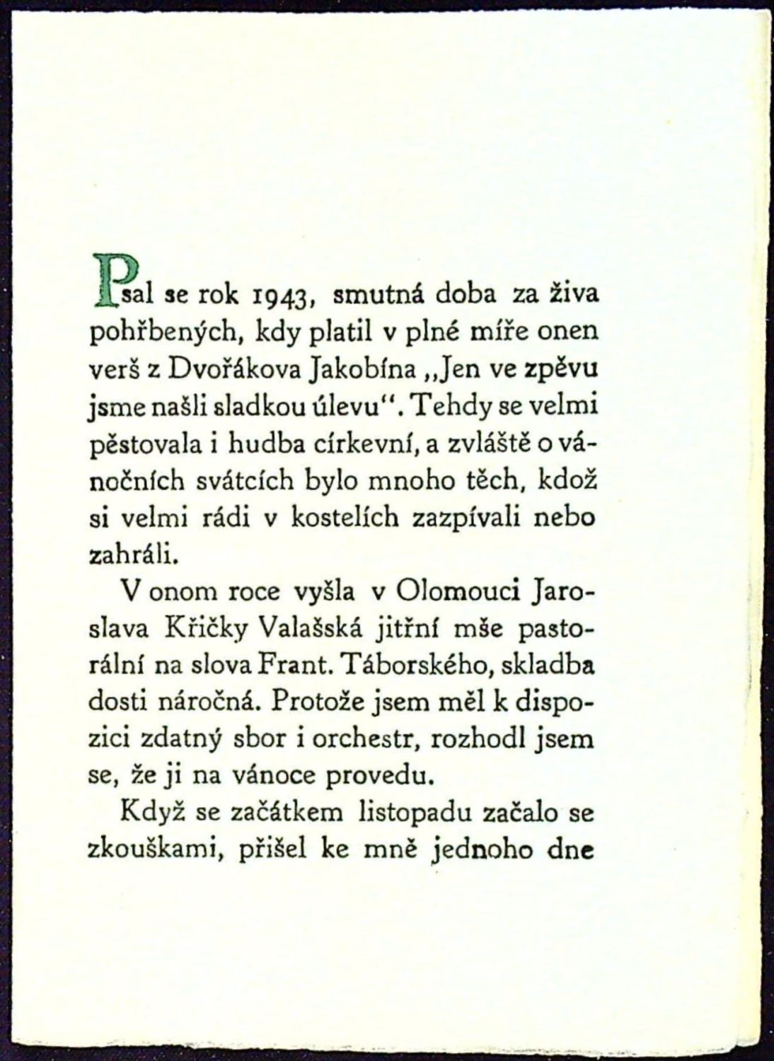 Jeden z neudaného počtu exemplářů, které vysadil a na ručním papíře na ručním lisu vytiskl Alois Chvála. - Pův pap. obálka s chlopněmi, ve které je volně vložený tiskový blok. Na přední straně obálky dřevoryt.