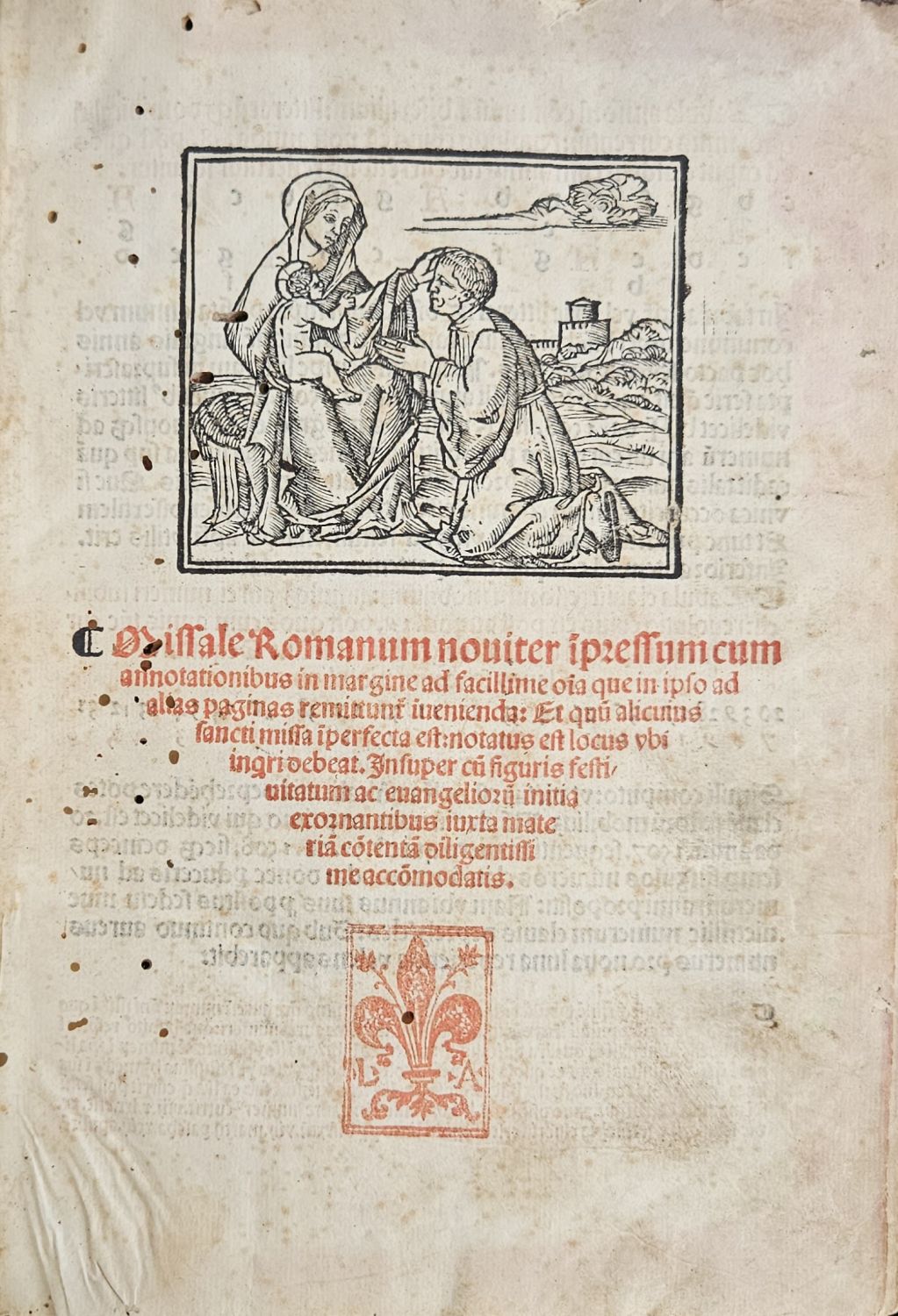 Missale Romanum nouiter ip[m]ressum cum annotationibus in margine ad facillime o[mn]ia que in ipso ad alias paginas rmittunt i[n]uenienda: Et quu[m] alicinus sancti missa i[m]perfecta est: notatus est locus vbi ingri debeat. Insuper cu[m] figuris festi, uitatum ac euangelior[u]m initia exornantibus iuxta materia[m] co[n]tenta[m] diligentissime acco[m]modatis.