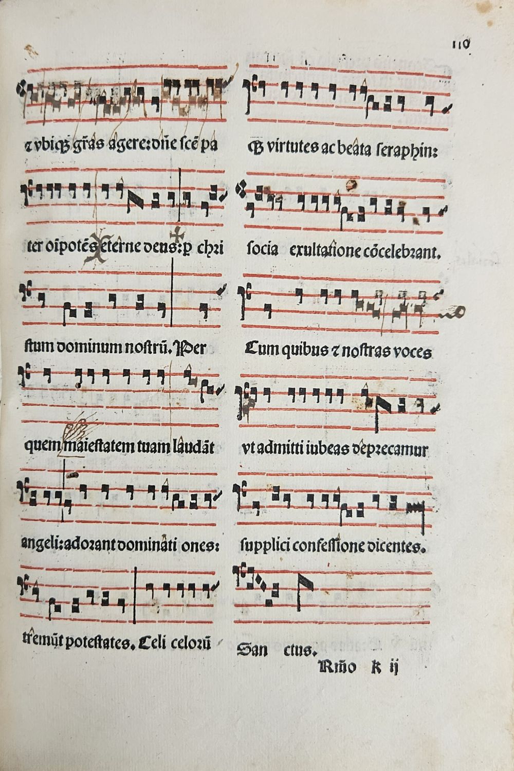 Tisk rotundou, dvoubarevný tisk (červeno-černý), tištěno ve dvou sloupcích, tabule svátků ve třech, živá záhlaví, paginace listů při vnějším horním okraji. Červeně tištěné versálky ve výši 2 řádků, řada konturových iniciál na ilustrativním pozadí ve výši 4-7 řádků. Na titulním listu dřevořez ve dvojitém jednoduchém rámečku (70 x 85 mm) a červeně tištěný signet tiskařův. Čtyř řádková notace. Chyby v paginaci (místo folia 41 natištěno 37, 43 (37), 176 (179), 224 (24), 226 nenatištěno). Impresum v kolofonu "Jossuq[ue] [et] impe[n]sis nobilis viri Lucantonij de Giunta florentini: Leonardo Lauretano serenissimo venetia[rom] principe imperante: Anno a nat[iuitate] d[omi]ni M.CCCC. IX, XJ. cale[n]das februarij in alma venetiarum vrbe mpressus ...." (11. 2. 1509) <br>Pozdně renesanční vazba, dřevěné desky potažené hovězinou, na obou deskách dvojitý rám zdobený slepotiskem, ve hřbetu 5 vazů, na přední desky dvě torsa kožených přezek, na desce zadní dva plechové úchyty. Na přídeštích a předsádkách mramorovaný papír z 20. století, na vakátech papír z 20. století. Vazba místy odřená. Titulní list zahnědlý a při spodním vnitřním okraji mírně pomačkaný, po folio 90 v textu drobné dírky od červotoče, folio 197 při spodním okraji nepravidelně oříznuté, folio 249 při horním vnějším okraji natržené, od folia 249 při spodním vnějším okraji světle hnědé mapy od vlhkosti, folio 263 při vnitřním okraji lehce natržené a vyspravené. V textu řada marginálií černým perem v latinském jazyce z 18. či 19. století, za textem přivázáno 11 listů černým a červeným perem kaligrafického rukopisu v latinském jazyku doplňujícím tištěný text, rukopis místy zčernalý a papír na několika místech proděravělý následkem putování červotoče.