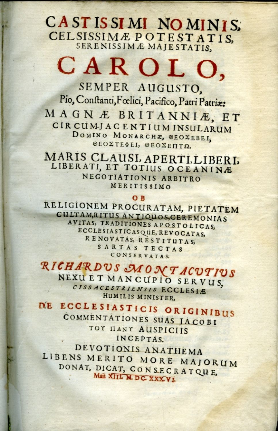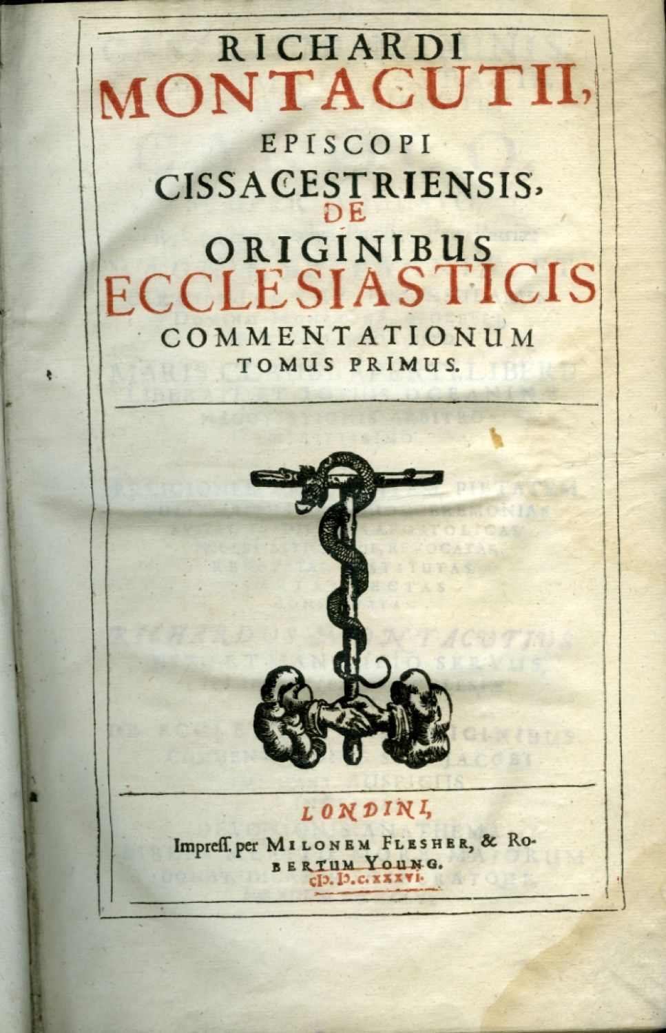 Vazba zašpiněná, rohy naražené, hřbet natřený šedou fermeží a s černým inkoustem psaným věcným názvem, na přední předsádce stará poznámka inkoustem, na spodních rozích a horních okrajích listů průběžně skvrny od vlhkosti. - Richard Montagu (či Mountague, 1577-1641), anglický duchovní, polemik, od r. 1638 biskup z Norwich.