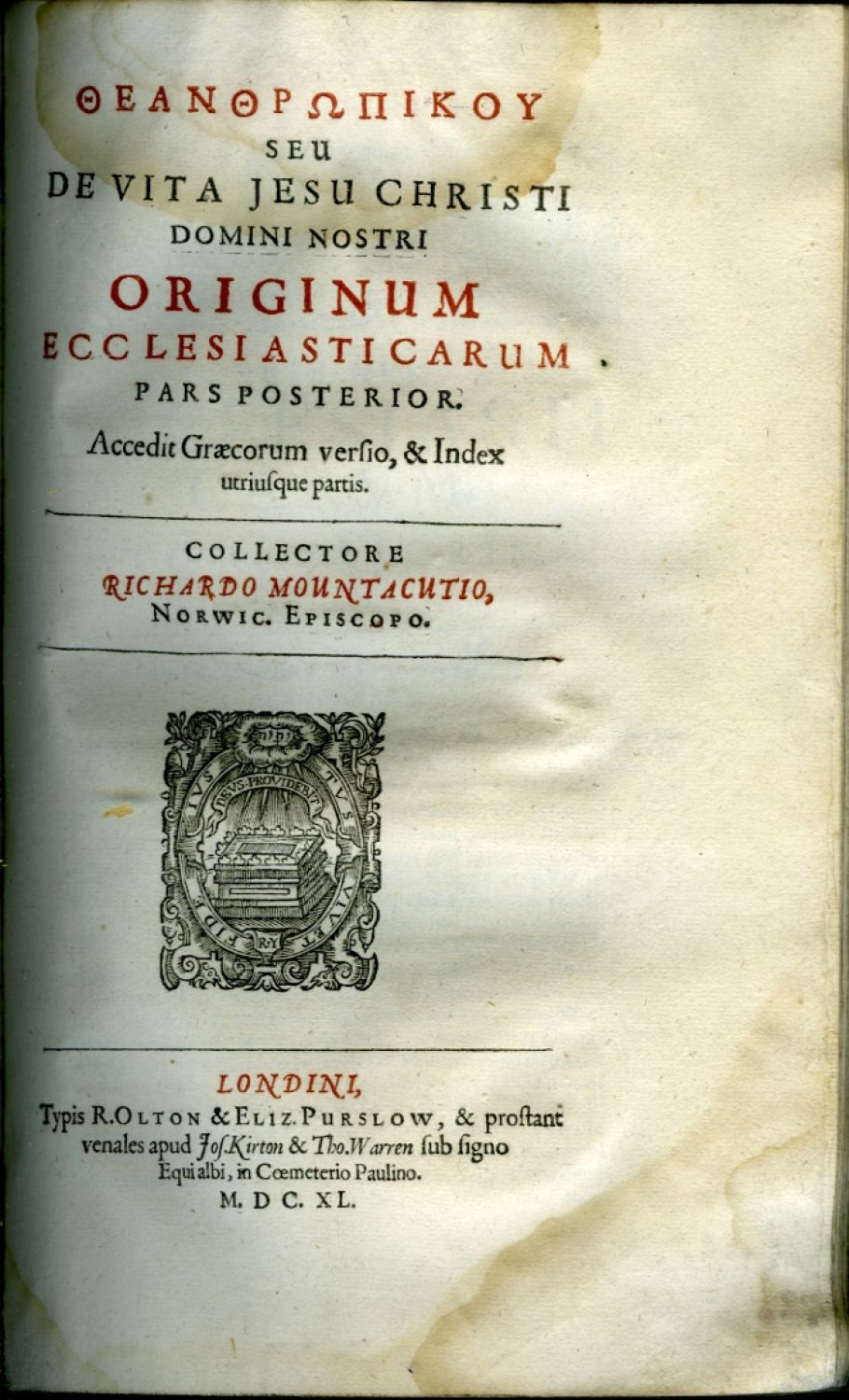 THEANTHROPIKON [alfabeta]: SEU DE VITA JESU CHRISTI DOMINI NOSTRI ORIGINUM ECCLESIASTICARUM LIBRI DUO. Accedit Graecorum versio, & Index utrisque Partis. COLLECTORE RICHARDO MOUNTACUTIO, NORWIC. EPISCOPO.