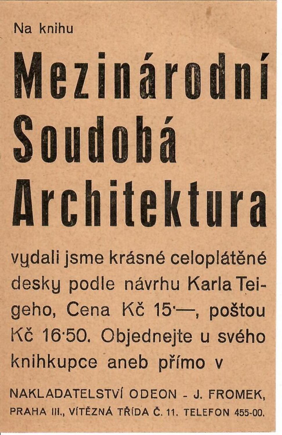 Původní papírová obálka podle návrhu Karla Teigeho, který knihu také typograficky upravil. V textu řada fotografických a ilustrativních vyobrazení. Přiložen původní tiskopis nakladatelství s údaji a možností objednání celoplátěných desek dle Teigova návrhu. <br>Papír při vnějším okraji přední obálky lehce zvlněný, v okrajích přední strany obálky mírné oslí uši.