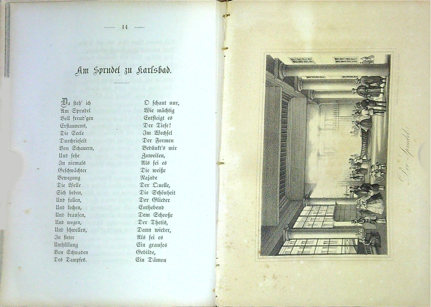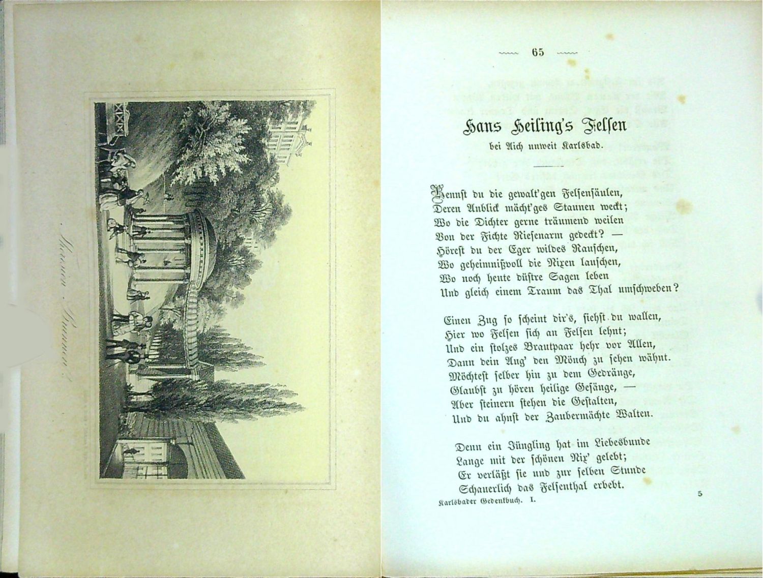 Nebehay 1114<br>Dva díly v jednom svazku. Za str. 96 prvního dílu notový tisk "Choral für Instrumental=Musik und Pianoforte" od Ernsta von Coburg-Gotha a "Lied von Heinrich Heine" od Emila von Wittgensteina. - Celoplátěná dobová ("lipská") vazba s lisovaným ornamentálním zrcadlem na obou deskách olemovaným tlačeným a zlaceným rámečkem, na přední desce uvnitř zrcadla tlačený a zlacený název, ručně šitý kapitálek, dobový papír s ornamentem na předsádkách. - Papír mírně zahnědlý a místy lehce zaprášený, naražené rohy, hřbet při horním okraji lehce naprasklý.<br>V úvodu knihy jsou stručně popsány dějiny města a jeho léčivých pramenů, doplněné a řadu básní se vztahem k místu a zápisů z knihy hostů.