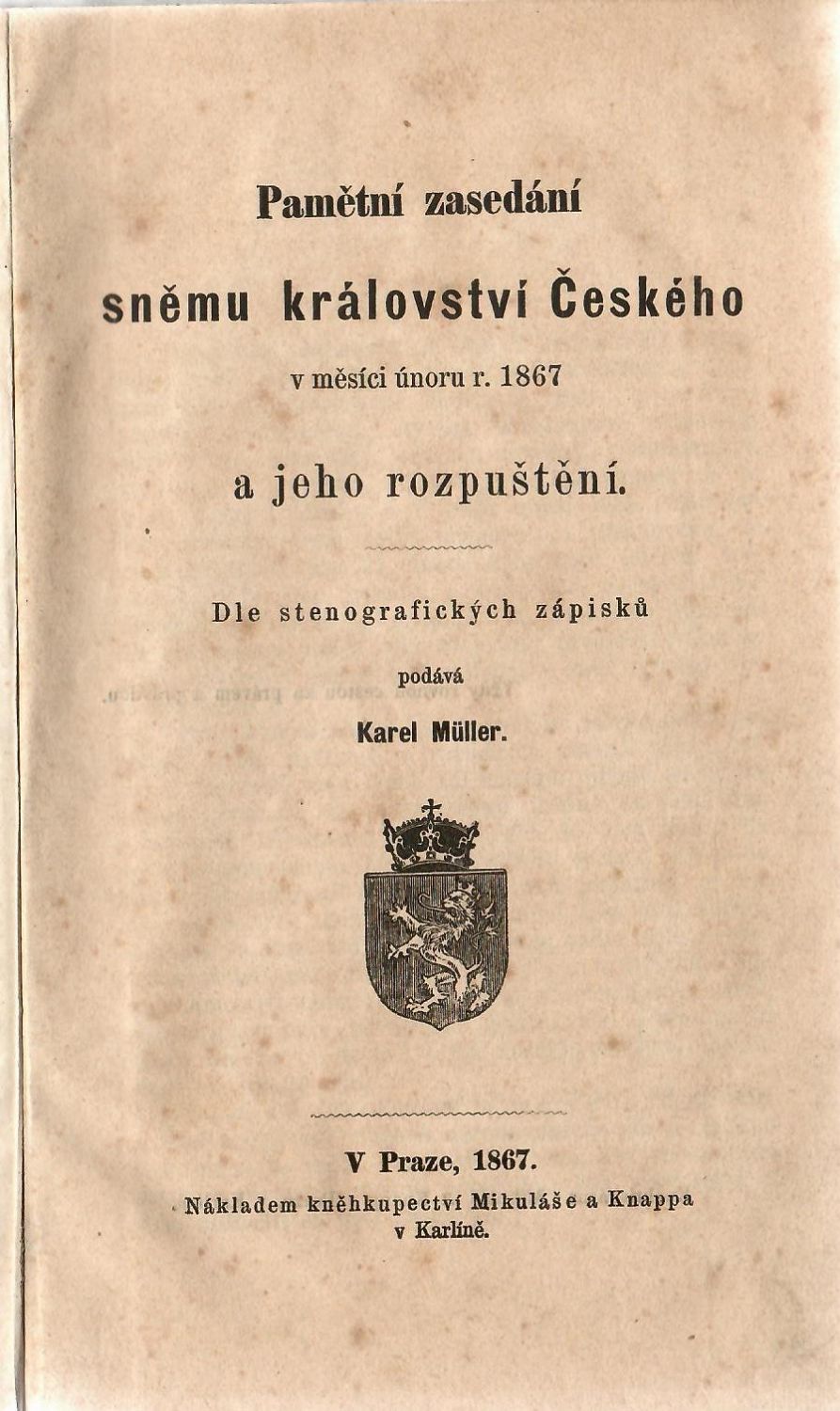 Antikva, na titulním listu dřevoryt s vyobrazením českého zemského znaku.<br>+ přívazek: Müller, Karel "Druhé zasedání sněmu království Českého v měsíci dubnu 1867 a naše šlechta", Praha, Mikuláš a Knapp, 1867, 96 stran, antikva, seznamy hlasující šlechty tištěny ve dvou sloupcích, na tit. listu dřevoryt s českým zemským znakem. <br>Dobová plátěná vazba, černé desky, hnědý hřbet a nárožnice, papír lehce zahnědlý, , místy hnědé skvrny.