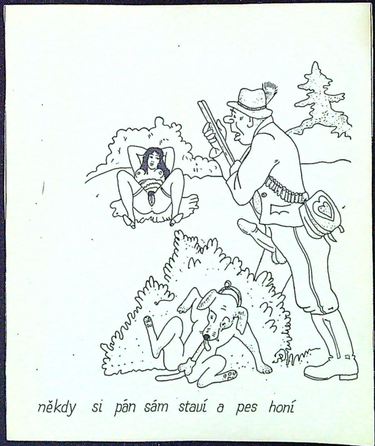 Hýsek 341; 342; 506 (jiná vydání)<br> Původní papírová obálka, ve které je volně vloženo 11 listů s reprodukcemi pornografických kreseb s kaligraficky psanými názvy. Na přední straně obálky obálky název a pornograf. kresba, na straně zadní hlava myslivce v klobouku. Názvy kreseb: zakázaný způsob honitby; záraz; někdy si pán staví a pes honí; pytlák, probírka mlází; ohledávání nory; hodím si ji přes rameno a pospíchám k lesu; sázení mladé kultury; škodná; na číhané; na vysokou. Rozměr knižního bloku 145 x 120 mm, tištěno po lícové straně listů.