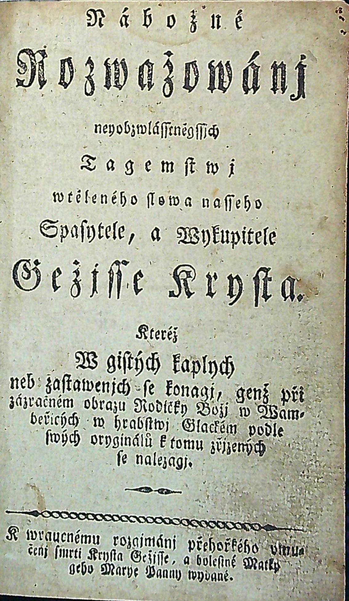 Nábožné Rozwažowánj neyobzwlásseněgssjch Tagemstwj wtěleného slowa nasseho Spasytele, a Wykupitele Gežjsse Krysta. Kteréž W gistých kaplych neb zastawenjch se konagj, genž při zázračném obrazu Rodičky Božj w Wambeřicých w hrabstwj Glackém podle swých oryginálů k tomu zřjzených se nalezagj. K wraucnému rozgjmánj přehořkého vmučenj smrti Krysta Gežjsse, a bolestné Matky geho Marye Panny wydané.
