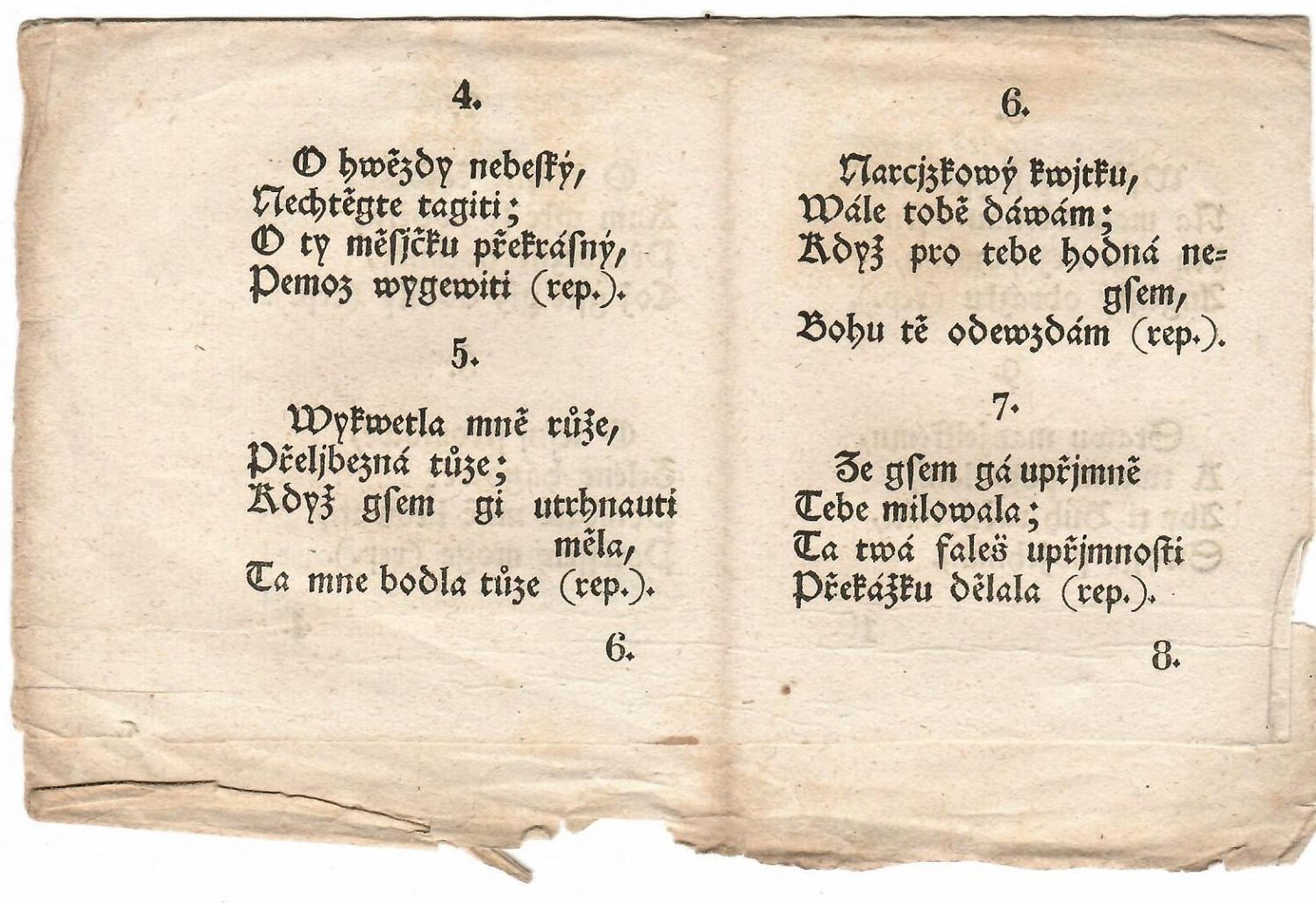 Tištěno švabachem, deset arabsky číslovaných strof, na tit. listu dřevořezová viněta, impresum pod tuně tištěnou mizící linkou, v záhlaví první strofy viněta s vyobrazením stylizované vázy s kvetinou.
