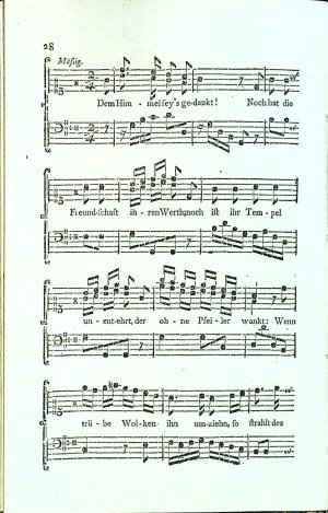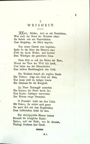 Tištěno antikvou, jeden z přednostních výtisků tištěných na ručním papíře Honig silnější gramáže. Na titulním listu viněta (mezzotinta kombinovaná s mědirytinou), v textu na 79 stranách vesměs celostránková pětiřádková notace s připojenými texty. V úvodu tištěná dedikace autorova Friedrichu Wilhelmu princi pruskému, za ní úvodní slovo [Joh. Wilh. Bernh. Hymmena] datované v Berlíně 28.2. 1782. Kniha je členěna do 2 částí: I. "Deutsche Freymäurerlieder" (obsahuje XXX písní + notový dodatek s 3 písněmi); II. "Chansons Maconniques" (10 písní).