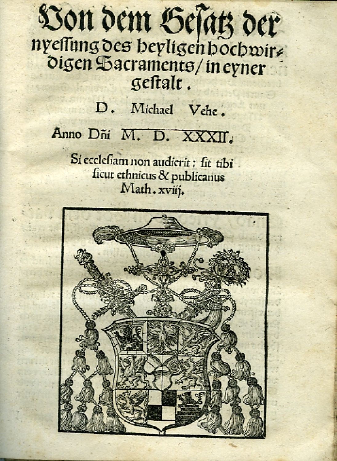 Signatury, kustody, živá záhlaví, římská paginace listů, tištěné poznámky po stranách. V textu osm konturových iniciál v jednoduchém rámečku zalomených do výše deseti řádků s andílky v pozadí, tučně tištěné versálky ve výši čtyř řádků, rubriky, impresum v kolofonu, datované srpen 1531. - VD 16 N249<br> + přívazek: Vehe, Michael D.: Von dem Gesatz der nyessung des heyligen hochwirdigen Sacraments, in eyner gestalt. Leypzig, Nicolas Schmydt, 1532, [16] listů. Na tit. listu dřevořezový erb v jednoduchém rámečku, na spodním okraji fol. A3a dřevořez v jednoduchém rámečku s vyobrazením dvou lvů v jeskyni, konturová iniciála na rostlinném pozadí ve výši 7 řádků, gotika, signatury, kustody, tištěné poznámky po stranách, impresum v kolofonu, rub posledního listu nepotištěný. - VD 16 V489<br>Pergamenová vazba z rukopisu s notovým záznamemze 14. století, torso dvou párů kožených vázacích tkanic, při horním okraji hřbetu pap. štítek s rkp. věcným názvem. Vazba s tmavými skvrnami, na deskách a předsádkových papírech stopy po červotoči, na prvním titulu a okraji předních listů hnědé skvrny. Knižní blok lehce oříznutý, na předních i zadních palistech rukopisné latinské poznámky černým perem.<br>Friedrich Nausea (cca 1496 - 1552 Trient), původním jménem Friedrich Grau, byl vídeňským biskupem a dvorním kazatelem císaře Ferdinanda.