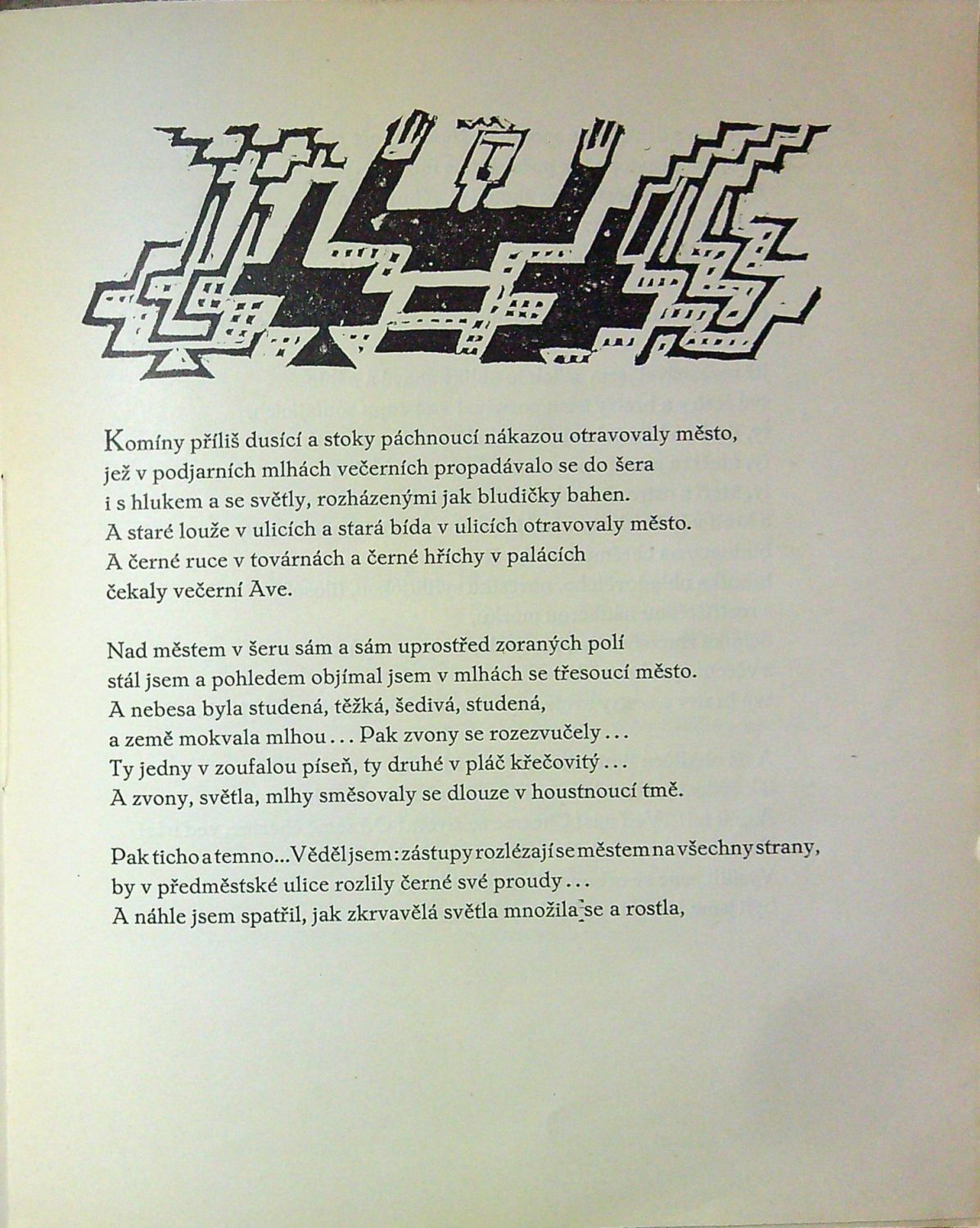 | Ilustrace: | Josef Čapek vyzdobil linoryty - na přední i zadní straně obálky, na předsádkách dvoubarevně tištěnými, celostr. ve frontispisu, dvěma linoryty v textu a nakladatelskou značkou. |