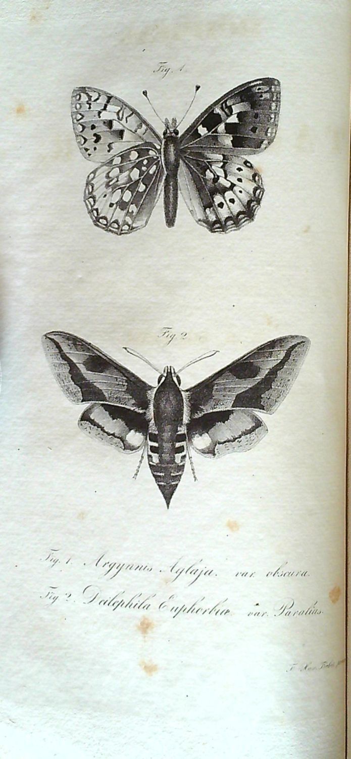 Tištěno antikvou, ve front. litografie s vyobrazením dvou motýlů dle kresby F. Fiebera. Původní papírová obálka, v textu několik drobných hnědých skvrnek, jinak ve stavu velmi dobrém.<br>František Antonín Nickerl (4.12. 1813 Praha - 4.2. 1871 Praha), český lékař a entomolog německého původu. Od roku 1854 profesor přírodovědy na pražské polytechnické universitě. Věnoval se především studiu motýlů a objevil několik nových druhů, jeden druh můry byl pojmenován na jeho počest "Luperina nickerlii". Zasloužil se o publikování prvních seznamů motýlů z území Čech. Nabízená práce vznikla ještě během jeho studia na pražské Karlo-Ferdinandově universitě a pojednává o denních motýlech v Čechách.