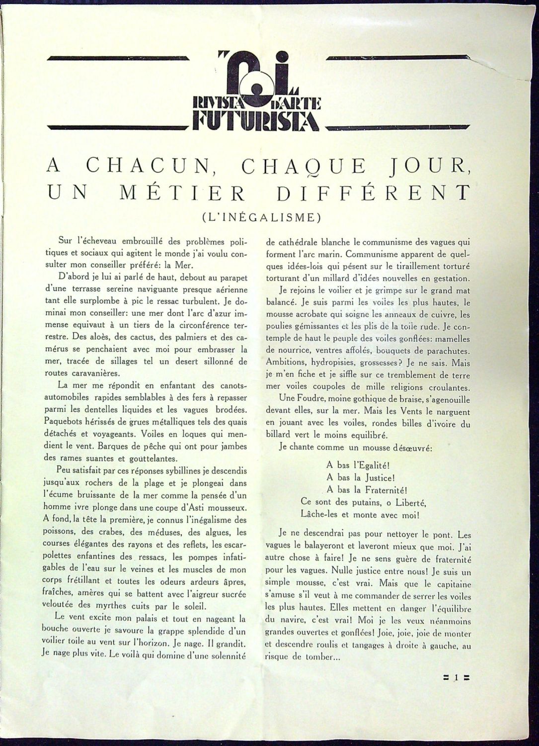 V textu 11 černobílých reprodukcí obrazů (Balla, Prampolini, Deoero, Marasco, Pettoruti, Idelson, Belzova, Miklos, Mohr a Nagano - dva obrazy), na jedné straně faksimile (ukázka notace futuristického baletu od Franca Casavola), úvodní text Marinettiho a ukázka jeho hudební produkce na text francouzského básníka Nicolase Beaduina. <br>Původní sešit o rozměru 345 x 245 mm s dvoubarevně tištěnou obálkou (modro-černou), uprostřed svisle mírně přeložený a při pravém horním okraji natržený v šíři cca 3 cm, na zadní straně reklamy na různé evropské avantgardní časopisy (z Čech na Disk).<br>Jedno číslo slavného a velmi vzácného italského futuristického časopisu, který vycházel v letech 1917-1925 pod redakcí Enrica Prampoliniho.