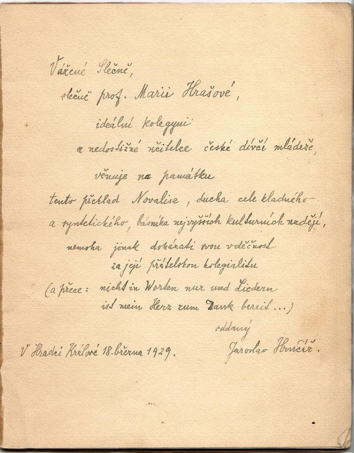 Sáňka 99<br>Vydáno 50 prodejných a číslovaných výtisků (u tohoto exempláře místo čísla napsáno mimo prodej). Přeložil Alois Král a typy písma Ehmcke na ruční papír vytiskla "Grafia". Vyzdobil Jan Konůpek (na přední straně obálky zdobný dřevorytový rám, ze štočku tištěný frontispis a titulní list, v textu tři celostránkové, autorem tužkou podepsané a datované, Konůpkovy lepty. Plné iniciály ve výši 3 řádků. <br>Původní pap. obálka, lehce zašpiněná, papír obálky při vnějším okraji pomačkaný a zkrabatělý, pap. pokryv hřbetu odlepený od knižního bloku. Na přední předsádce rkp. dedikace slečně prof. Marii Hrašové ..." datovaná 18. března 1929 v Hradci Králové od "Jaroslava Hrnčíře". Spodní roh posledního nepotištěného listu přeložený.