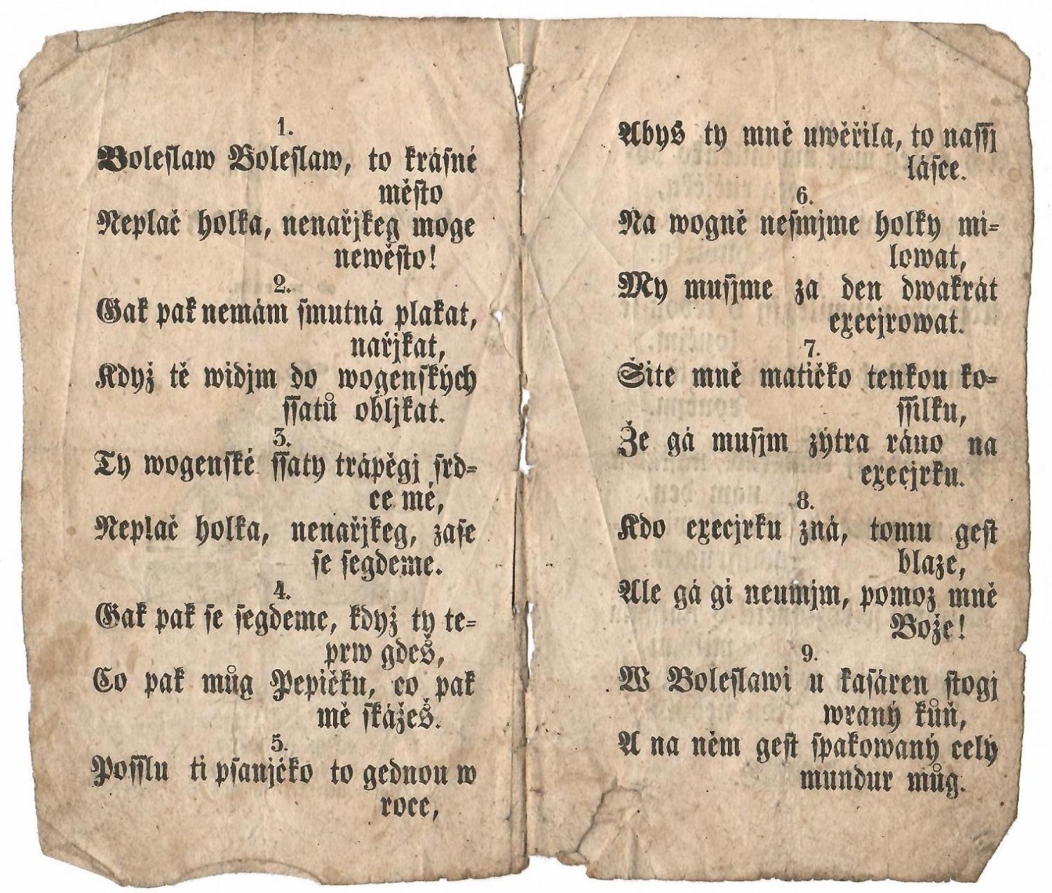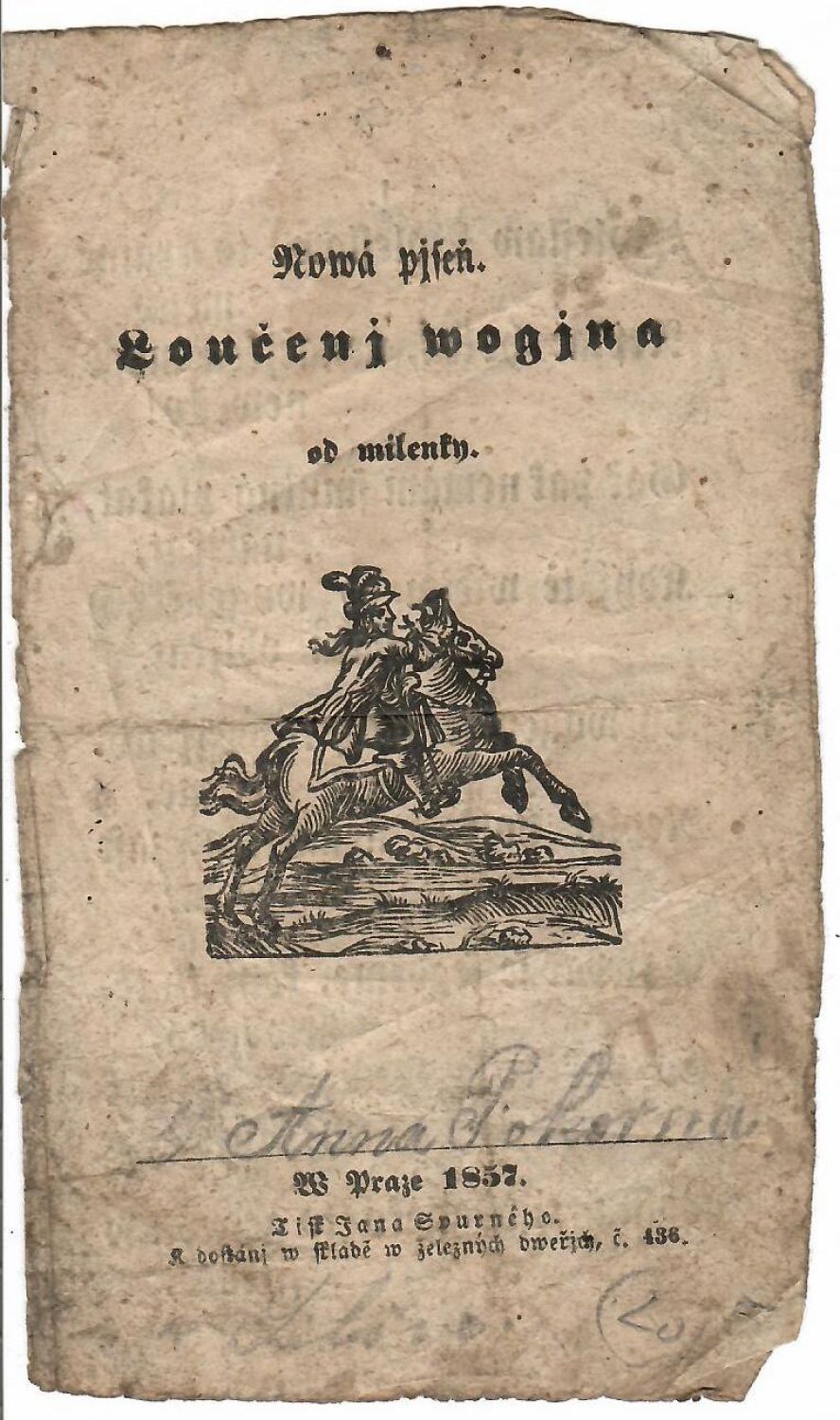 Tištěno švabachem, 13 arabsky číslovaných strof. Na tit. listu dřevorytová viněta s vyobrazením vojáka na pádícím koni. - Papír zašpiněný, při okrajích pomačkaný, na druhém listu při spodním okraji u hřbetu natržený.