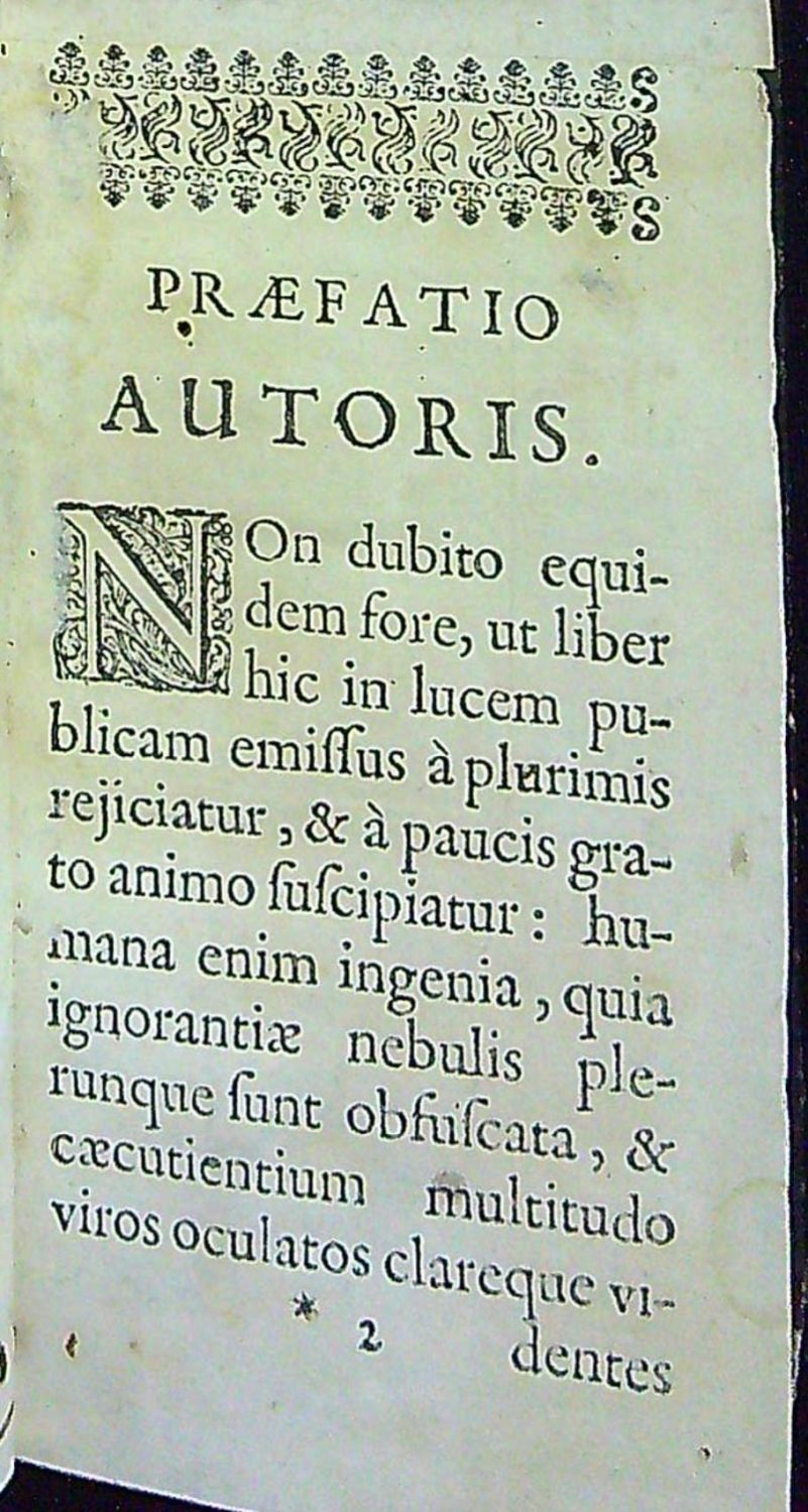 Červeno-černě tištěný titulní list s vinětou, konturové iniciály na rostlinném pozadí zalomené do výše 3-5 řádků, vstupní pásový vlys z ornamentů, tučně tištěné versálky ve výši 2 řádků, neživá záhlaví., viněty. Do latiny z francouzského originálu přeložil Ludwig Combach.<br>Kartonová vazba s deskami potaženými olejovým papírem, při horním okraji hřbetu vínově červený kožený štítek s tlačeným a zlaceným názvem, černě barvená svrchní ořízka. Při spodním okraji hřbetu starý pap. štítek s evidenčním číslem. Na přední předsádce utržen kousek papíru, titulní list při horním okraji podélně podlepený (cca 0,8 cm) a místy odřený, při spodním jeho okraji staré razítko zednářské lóže "Bibliothek der Loge zu Münster i. W." a perem napsané číslo. Pět listů předmluvy při horním okraji dolitých (v šíři cca 0,5 cm). <br>Clovis Hesteau de Nuysement (cca 1555 Blois - 1623/24 ?) francouzský básník, překladatel a alchymista. Pracoval také pro slavného antverpského tiskaře Ch. Plantina.