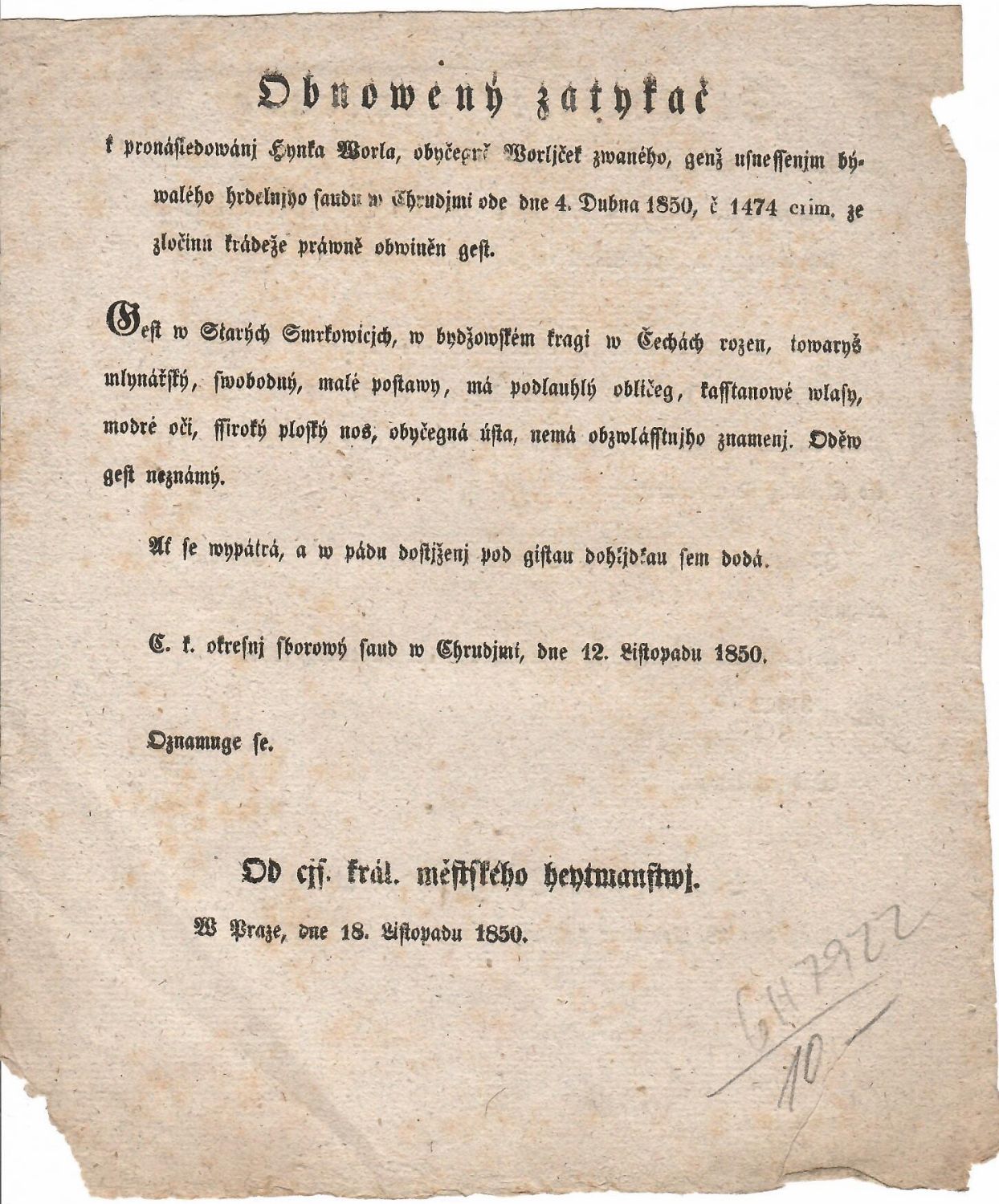 Obnowený zatykač k pronásledowánj Hynka Worla, obyčegně Worljček zwaného, genž usnessenjm býwalého hrdelnjho saudu w Chrudjmi ode dne 4. Dubna 1850, č 1474 crim. ze zločinu krádeže práwně obwiněn gest.
