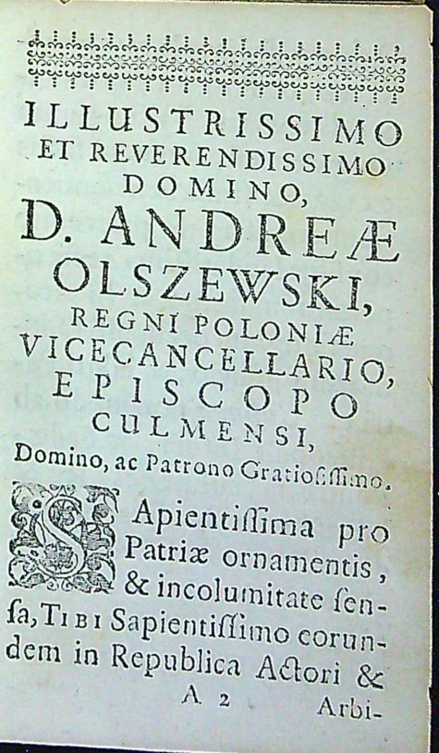 VD 17 32:678667C; H-B. I,9149.<br>Konturové iniciály na ornamentálním pozadí zalomené do výše 3-4 řádků, tučně tištěné versálky ve výši 2 řádků, pásové lišty z ornamentů, žaludy, viněty.<br>Dobová pergamenová vazba, podél přední i zadní desky u hřbetu chybí zčásti pap. pokryv, papír přední předsádky v jednom místě proděravělý, na tit. listu rkp. přípis jednoho z předchozích vlastníků "Domus Proffes. Jesu Vien 1705".<br>Anrzej Olszowski (27.1. 1621 Olszow - 29.8. 1677 Gdaňsk) polský politický řečník a spisovatel. V letech 1661 až 1674 biskup v Chelmně a od roku 1674 arcibiskup v Hnězdně a polský primas. V letech 1657 až 1667 byl proboštem poznaňské katedrální kapituly a v letech 1666 až 1676 zástupcem korunního kancléře.