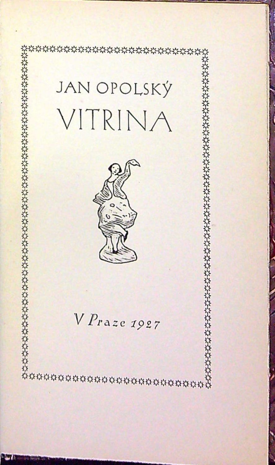 Individuální vazba s kartonovými deskami potaženými mramorovaným papírem, ve hřbetu kožený štítek s tlačeným a zlaceným jménem autora, na předním přídeští nalepeno ex libris Miloše Dyrynka.