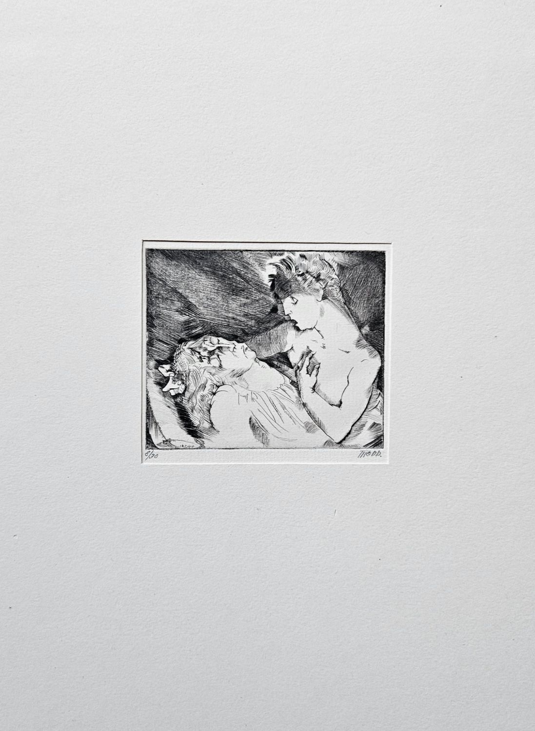 | Ilustrace: | Deset původních leptů (včetně titulního listu), vpravo dole pod deskou autorem tužkou podepsaných, vlevo dole číslovaných 8/30. Album vydal Bruno Cassirer v Berlíně. Původní kartonové desky s chlopněmi a plátěným hřbetem (spodní chlopeň odpadlá), rozměr vazby 503 x 332 mm, lepty jsou vytištěny na papíře o rozměru 260 x 215 mm, který je namontován do pasparty o rozměru 485 x 325 mm (původní adjustace). |