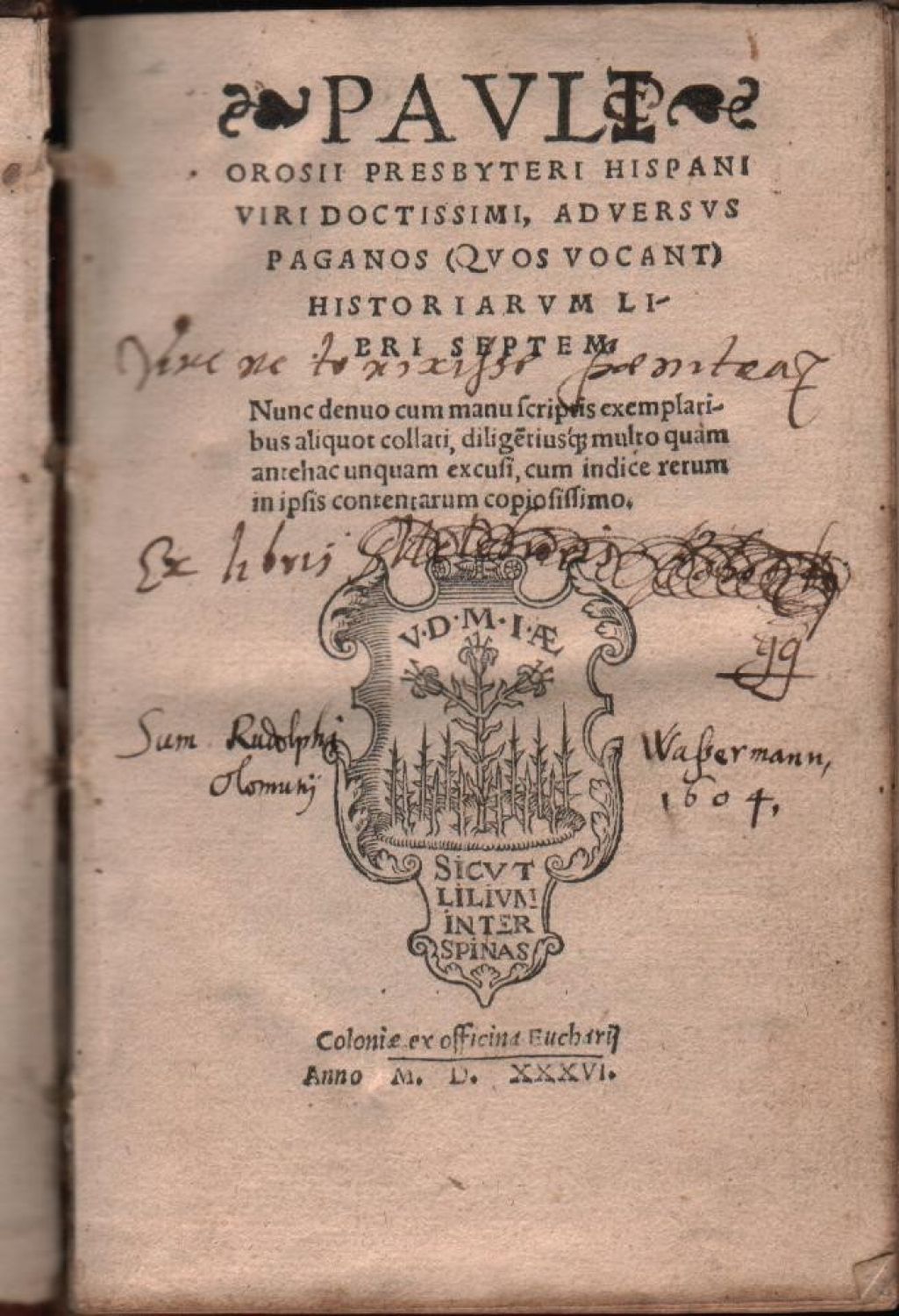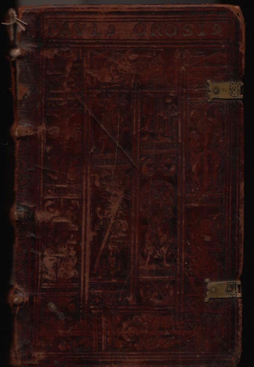 Titulní list částečně tištěný versálkami, na tit. listu dřevořezová viněta, živá záhlaví, tištěné poznámky po stranách, plné iniciálky zalomené do výše dvou řádků, několik konturových iniciál v rámečku na pozadí nábožensko-symbolického obsahu zalomených do výše 4,7,8 a 9 řádků, na str. 62 velká obrysová iniciála s mladým bojovníkem v pozadí zalomená do výše 11 řádků, na str. 183 s mladíkem držícím v ruce ratolest též zalomená do výše 11 řádků.<br>Dobová tlačená renesanční vazba z bukových destiček potažených hnědou hovězinou, na přední desce dvojité zrcadlo, při jeho horním okraji tlačené jméno autora knihy, v rámu zrcadla biblické výjevy a latinské opakující se nápisy, uvnitř zrcadla výjevy náboženského obsahu, na zadní desce je rám dvojitého zrcadla tvořen kulatými medailonkami s portréty, které jsou od sebe oddělené rostlinným dekorem, uvnitř zrcadla biblické výjevy. Ve hřbetu čtyři vazy, na přední desce dva původní kovové úchyty, na zadní desce zbytky kování pro uchycení spon, které chybí. Vazba ohmataná a odřená, při horním okraji hřbetu až po druhý vaz potrhaná, na zadní desce při kování a ve spodním okraji rámu chybí kousky kůže. Na tit. listu provenienční záznam z roku 16O4 Rudolph Wassermann, Olomouc 1604), druhý je přeškrtaný a nečitelný, na předním přídeští rkp. poznámky perem ze 17. století, v textu též několik poznámek ze stejné doby.<br>Paulus Orosius (cca 375 pravděpodobně Braga - po 418), historik a teolog, žák sv. Augustina, spolupracovník sv. Jeronýma. Autor tří knih, ze kterých je nejvíce ceněné námi nabízené dílo, ve kterém se autor pokusil o sepsání dějin světa od Adama. Jedná se o první dějiny světa sepsané křesťanem. V knize se autor mimo jiné pokusil vyvrátit argumenty názor, že pád Říše římské způsobilo přijetí křesťanství. Historickou hodnotu knihy mají však pouze místa popisující události po roce 378.
