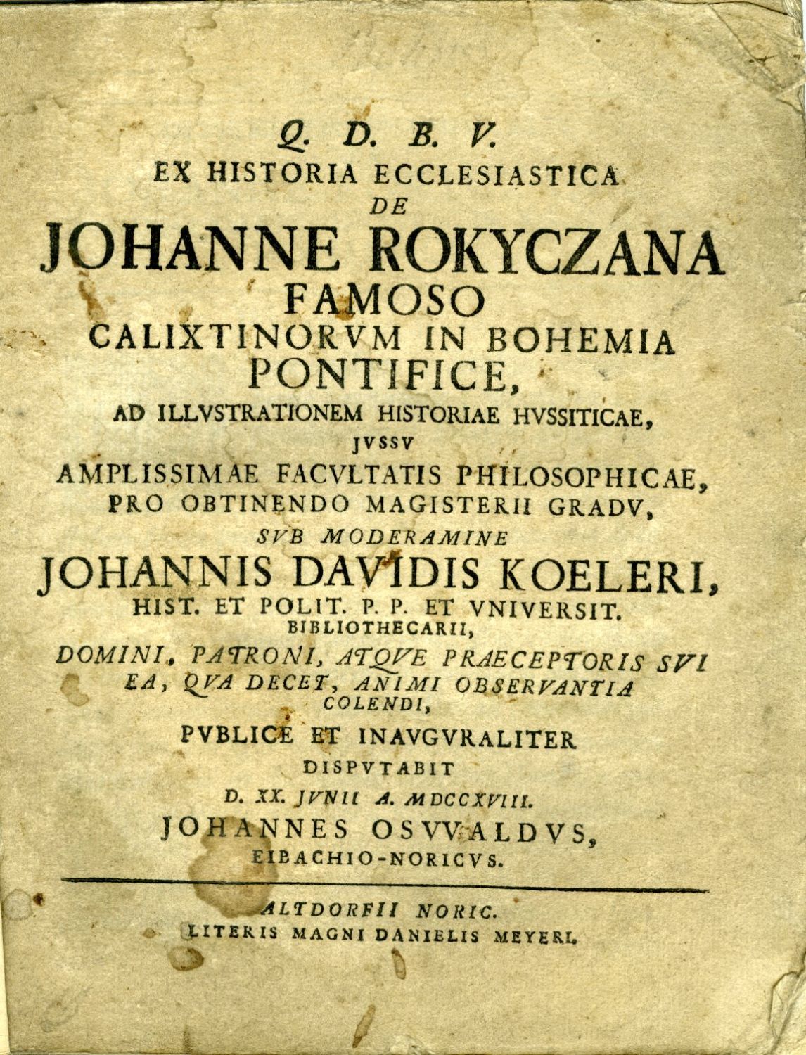 Q. D. B. V. EX HISTORIA ECCLESIASTICA DE JOHANNE ROKYCZANA FAMOSO CALIXTINORVM IN BOHEMIA PONTIFICE, AD ILLVSTRATIONEM HISTORIAE HVSSITICAE, JVSSV AMPLISSIMAE FACVLTATIS PHILOSOPHICAE, PRO OBTENDO MAGISTERII GRADV, SVB MODERAMINE JOHANNIS DAVIDIS KOELERI, ... PVBLICE ET INAVGVRALITER DISPVTABIT ...
