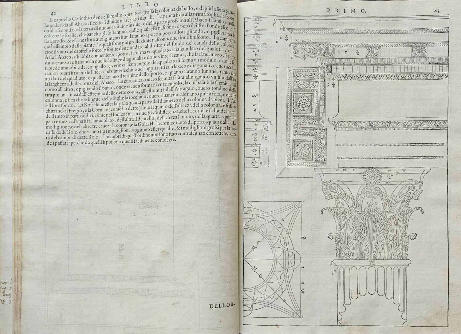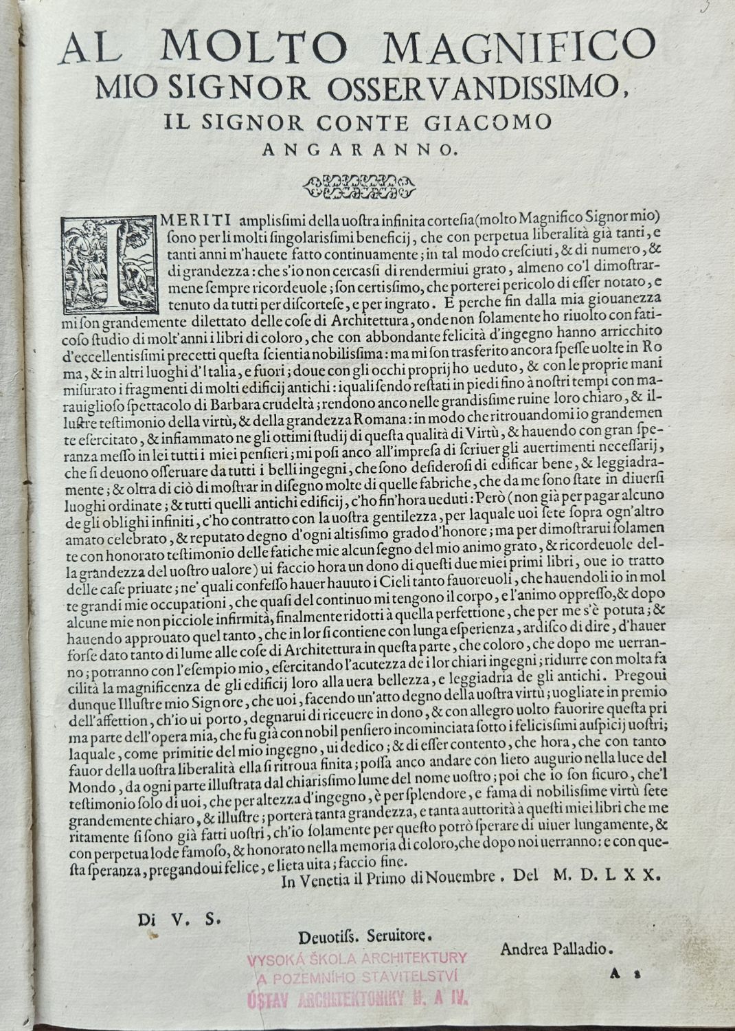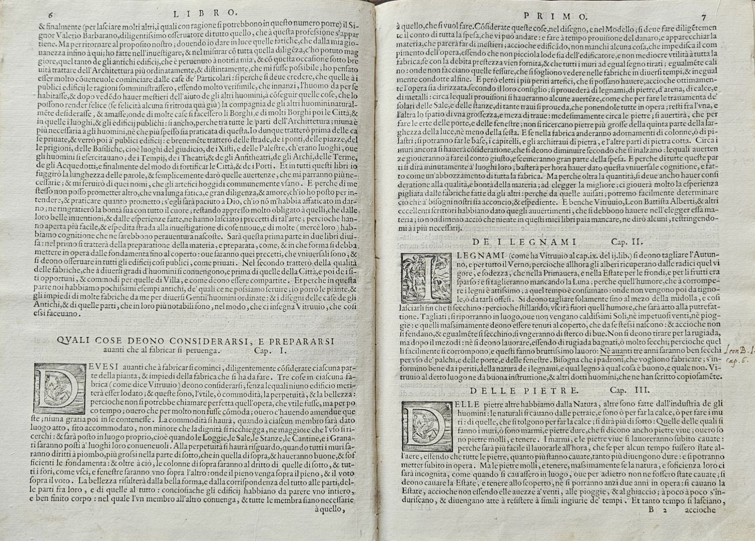 Řada konturových iniciál v jednoduchém rámečku na ilustrativním pozadí zalomených do výše 6 řádků, v kolofonu 4. knihy signet tiskařův.<br>Kartonová vazba (298 x 215 mm) potažená tmavým plátnem z konce 19. století. Vazba ohmataná, zadní deska zčásti odřená, naražené rohy. Na titulním listu starý provenienční přípis "Collegii Lyncensis Societatis Jesu Catalogo inscriptus Anno 1628", na předním přídeští knih. papírový štítek s číslem a datem 1910, na přední předsádce, poslední straně 4. knihy a spodní ořízce razítko z 30. let 20. století České učení technické v Praze Ústav architektoniky II. a IV. Prof. Dr. Ant. Mendl", při spodním okraji třetí strany 1. knihy staré razítko "Vysoká škola architektury a pozemního stavitelství Ústav architektoniky II. a IV.".<br>Andrea Palladio (30.11. 1508 Padova - 19.8. 1580 Maser u Trevisa), jeden z nejslavnějších a nejvlivnějších pozdně renesančních architektů a teoretiků architektury. Nabízené dílo je první a kompletní vydání stěžejní autorovy knihy, která navazuje na Vitruvia, kterého autor považoval za svého učitele. Dílo je rozděleno do čtyř částí. První kniha obsahuje 29 kapitol a pojednává o přípravě staveb, stavebním materiálu, kvalitě půdy pro základy stavby, druzích zdí a jejich vlastnostech, stavebních slozích a podrobnému popisu vnitřních částí stavby. Druhá kniha obsahuje 17 kapitol věnovaných vybraným detailům významných staveb minulosti i současnosti. Třetí kniha se skládá z 21 kapitol a přináší údaje o autorových cestách, údaje o členění měst, ulicích, náměstích a basilikách, věnuje zvýšenou pozornost mostům s ukázkami staveb antických, ale také s návrhy staveb mostů autorových. Čtvrtá kniha má 31 kapitol a je věnována popisu staveb chrámů a místa pro jejich postavení s ukázkami významných chrámů tehdejší doby. V knize je i řada Palladiových plánů, které nemohly být z nejrůznějších důvodů realizovány, a které pak později inspirovaly řadu jiných architektů.