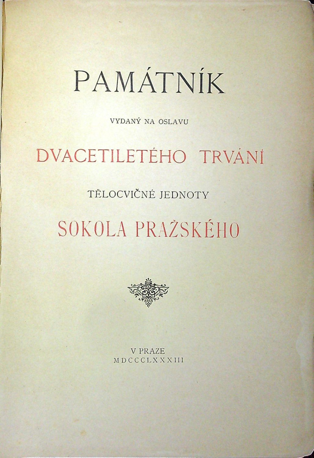 Památník Sokola pražského. Památník vydaný na oslavu dvacetiletého trvání tělocvičné jednoty Sokola pražského.