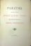 První 4 listy zcela odděleny od knižního bloku. Obě předsádky při hřbetu prasklé. Listy zažloutlé, místy světle hnědé flíčky. Desky potaženy červeným plátnem. Na přední desce tlačené zrcadlo s rostlinným dekorem a zlaceným věcným názvem. Ve hřbetu v druhém poli tlačený a zlacený věcný název. Rohy naraženy.