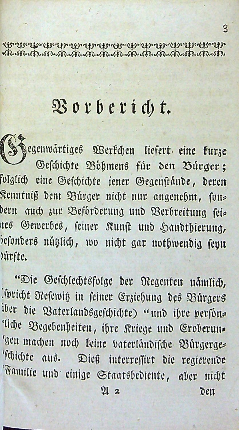 Knihopis 6910<r>Německý text a česká slova gotikou, signatury, stránkové kustody, arabské číslování stran při horním vnějším okraji, živá záhlaví, poznámky pod čarou, dřevořezové vlysy rostlinného dekoru, viněty, iniciály zalomené do výše 2 řádků, v textu 4 rozkládací přílohy (synchronistické tabulky), na titulním listě mědirytinová viněta.<br>Kartonová vazba potažená olejovým papírem, při horním okraji hřbetu temně zelený kožený štítek s tlačeným a zlaceným názvem. Listy od strany 239 až do konce pomačkané, na tit. listu nalepený proužek papíru přes pravděpodobně natržený papír (zasahuje při pravém horním okraji do viněty). Chybí mapa Král. českého.<br>Aleš Vincenc Pařízek (15.11. 1748 Praha - 15.4. 1822 Praha). Kněz, člen řádu Dominikánů, významný pedagog. Od r. 1790 ředitelem vzorové hlavní školy na Malé Straně v Praze. Navazuje na Felbigerovo osvícenské a filantropické pojetí, představitel jazykového školního utrakvismu.