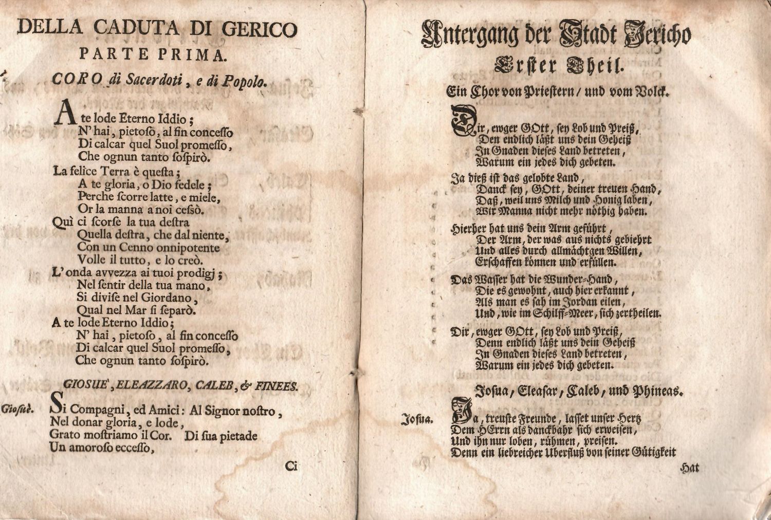 LA CADUTA DI GERICO AZIONE SACRA DA CANTARSI NELLA CHIESA DI S. FRANCESCO Del Sacro Ordine Militare de´Crocigeri colla Stella rossa in Praga presso al Ponte il Giorno DEL VENERDI SANCTO All´undeci ora di Mattina. Der Untergang der Stadt Jericho, ein geistliches Drama, welches In der Kirchen des heil. Franciscus des Ritterlichen Creutz=Ordens mit dem rothen Stern zu Prag nächst der Brücke Am Heiligen Charfreytag Vormittag um II. Uhr wird aufgeführet werden.