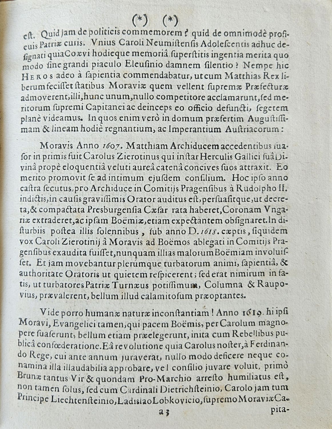 Pumprla P,3406; BCBT 41487 a 41486 (třetí díl neevidují); Zíbrt I, 23145; SKC neeviduje žádný kompletní exemplář. <br>Tisk latinkou, místy italikou, sazba ve dvou sloupcích, živá záhlaví, tištěné poznámky po stranách, na foliu a2 prvního dílu tištěná dedikace hraběti Žerotínovi. Konturové iniciály na rostlinném pozadí zalomené do výše 3-6 řádků, tučně tištěné versálky ve výši 2 řádků, viněty, pásové vlysy z drobného ornamentu. Tři titulní listy, v kolofonu prvého dílu uveden jako nakladatel Vít Jindřich Ettel, druhý díl vyšel roku 1670 u Anny Alžběty Ettelové a třetí roku 1676 u Jana Josefa Kiliana, k dostátní u knihkupce Ferdinanda Stohella.<br>Dobová vazba ze světlé vepřovice zdobené slepotiskem, barvené ořízky, ve hřbetu tři vazy, na přední desce tlačené a černě barvené vlastnické iniciály I.N.C. a datum 1691. Na přední desce dva kovové trny, na desce zadní původní kožené přezky a na přezce spodní původní plechový úchyt. Na tit. listu začerněné jméno jednoho z předchozích vlastníků.