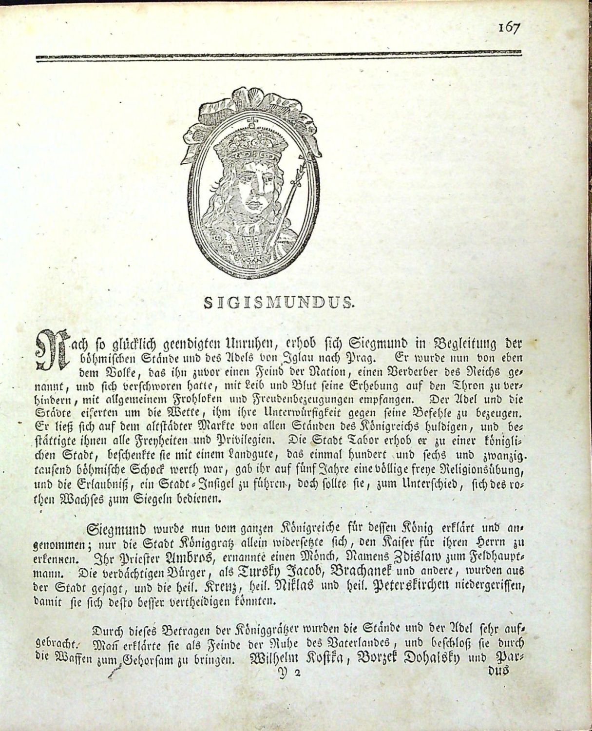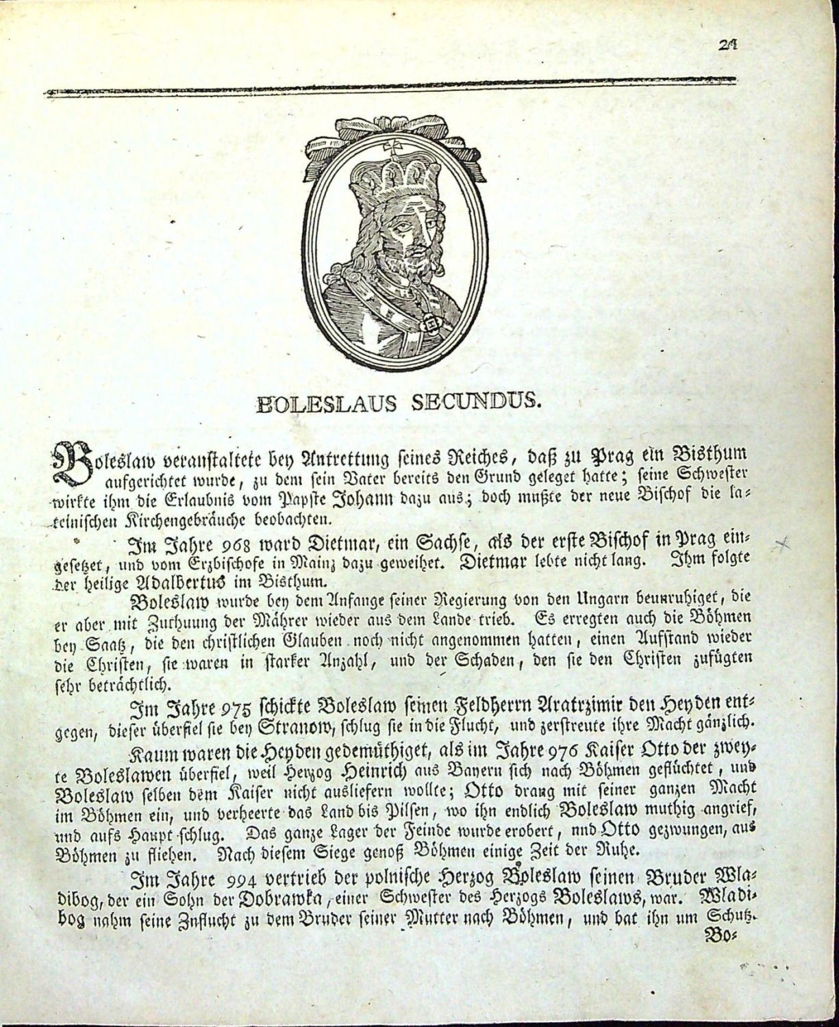 Knihopis 6975; Zíbrt I,1724; Holzmann-Bohatta VII,6071<br>Německý text gotikou, latinská jména panovníků versálkami a antikvou, signatury, stránkové kustody, arabské číslování stran při horním vnějším okraji, živá záhlaví, iniciály ve výši 2 řádků, viněty, dvojité jednoduché linky, viněty, rejstřík tištěný ve dvou sloupcích, chyby v paginaci. Za rejstříkem na s. 1 druhého dílu mezititul: "Beschreibung der königlichen Haupt= und Residenzstadt Prag. 1781", druhý díl tištěný ve dvou sloupcích, na s. 67/68 stručná historie Židovského města "Anhang von der Judenstadt", na s. 93 mezititul: "Geographischhistorische Beschreibung aller im Königreich Böheim befindlichen Städte, und anderer Merkwürdigkeiten. 1781". <br>Dobová vazba s kartonovými deskami potaženými škrobovým papírem, přes hřbet přelepená bílá kožená páska. Vazba ohmataná a odřená, naražené rohy. Červeně barvené ořízky. Papír místy lehce zahnědlý, tu a tam drobné světle hnědé skvrnky. Na několika listech přichycené dobové poznámky se vztahem k textu. Chybí frontispis. Pod vinětou perem napsané jméno jednoho z dřívějších vlastníků.<br>Zíbrt uvádí, že Kroniku do s. 220 podle V. Hájka z Libočan upravil Rosenhag, od Ferdinanda I. do s. 419 je autorem Pelcl, Popis Prahy je dílem prof. Ehmauta Elsenwangerische a geografický popis je přeložen z krátkého vypsání Země české od Josefa Táborského. Holzmann-Bohatta jako autora uvádí Xavera Franze Hubera, Tobolka autorství připisuje Pelclovi.