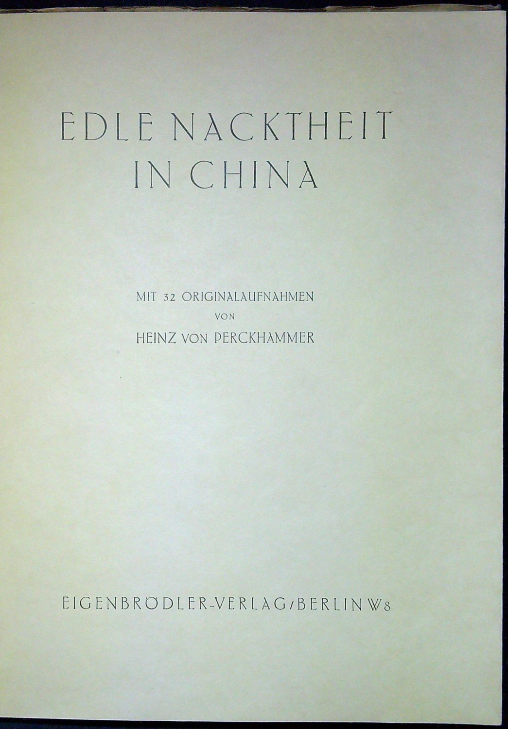 Za úvodním autorovým textem 32 fotografií tištěných hlubotiskem na líci a rubu nerozřezaného dvoulistu. Původní pap. obálka s fotografickým vyobrazením na přední straně.<br>Heinz von Perckhammer (3.3. 1895 Merano - 3.2. 1965 Merano), byl tyrolský fotograf, který se nejvíce proslavil svými čínskými akty a záběry různých scén z pekingských ulic. Za první světové války od roku 1917 do roku 1919 japonským válečným zajatcem, po propuštění strávil několik let v Číně, kde vznikly jeho nejznámější fotografie, které byly poprvé publikovány roku 1928 v Berlíně. Nabízená kniha (v českém překladu "Ušlechtilá nahota v Číně) obsahuje 32 umělecky stylizovaných ženských aktů, které částečně vznikly v macajských nevěstincích. V roce 1929 doprovázel jako fotoreportér berlínského časopisu plavbu vzducholodě "Graf Zeppelin" při její cestě světem. V roce 1932 založil v Berlíně fotografické studio, které se specializovalo na akty spojené s módní fotografií.