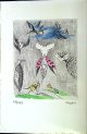 + Jehan Mayoux "A perte de vue", Ussel, Jehan Mayoux, 1958. 44 stran + 4 listy (z toho dva čistý), ve front. pův. suchá jehla (150 x 85 mm) od Charlese le Bars, autorem vpravo dole pod deskou tužkou podepsaná, vlevo dole číslovaná 47/273. Na patitulu rkp. dedikace autorova Maurici Lebrunovi. Červeně tištěný titul, versálky a jedna ilustrace za šesti, kterými je vyzdobena stať "Cuilléres d´amour" (Lžíce lásky), autor ilustrací - Claude Migeon. Obě díla vyšla společně a jsou tištěna na stejný papír, stejným písmem a stejným tiskařem.