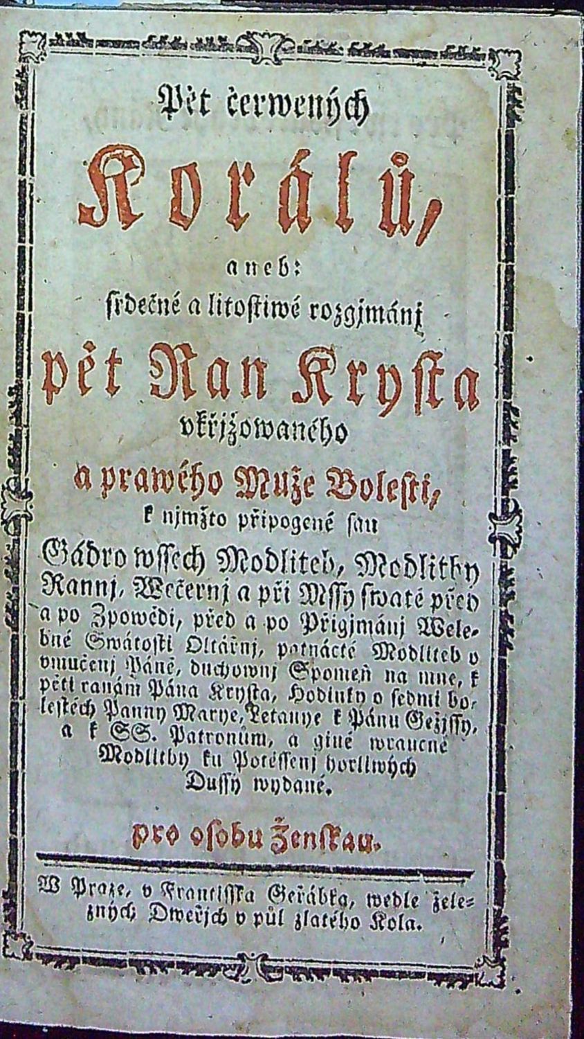 Pět čerwených Korálů, aneb: srdečné a litostiwé rozgjmánj pět Ran Krysta vkřižowaného a prawého Muže Bolesti, k njmžto připogené sau Gádro wssech Modliteb, Modlitby Rannj, Wečernj a při Mssy swaté před a po Zpowědi, před a po Přigjmánj Wlebné Swátosti Oltářnj, patnácté Modliteb o pěti ranách Pána Krysta, Hodinky o sedmi bolestéch Panny Marye, Letannye k Pánu Gežjssy, a k SS. Patronům, a giné wraucné Modlitby ku Potěssenj horliwých Dussy wydané. pro osobu Ženskau.
