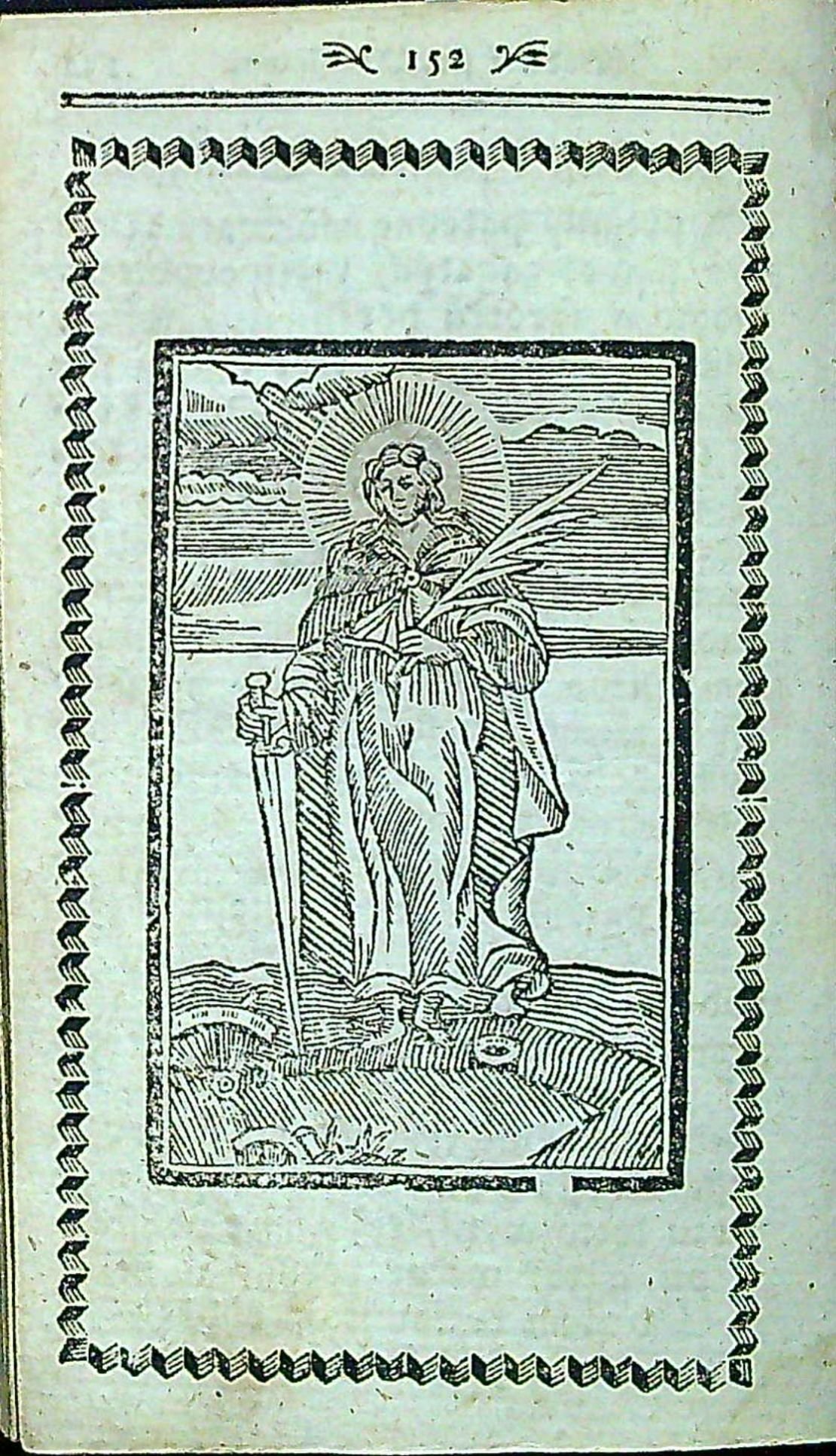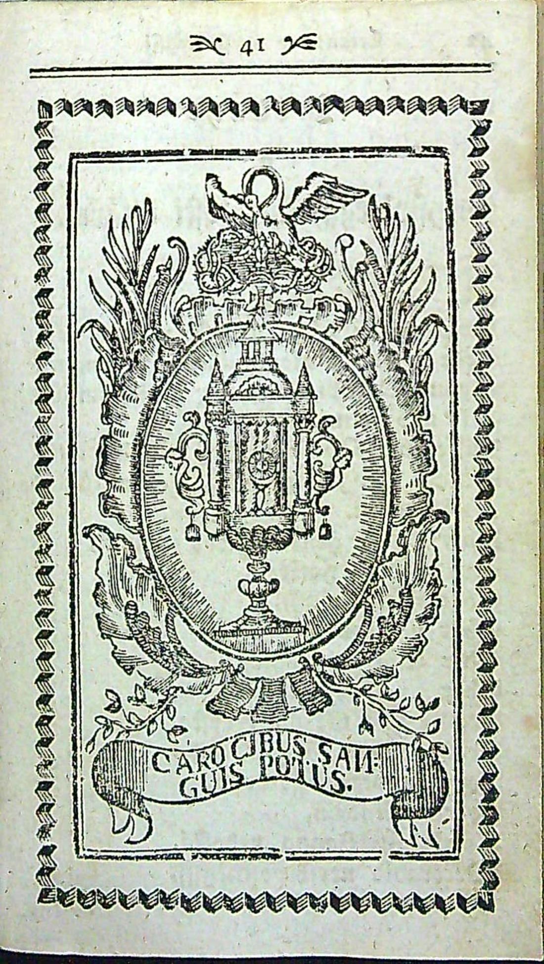 Kožená vazba z poloviny 19. století. Na obou deskách tlačený ozdobný rám se zrcadlem, na přední desce přes zrcadlo plechový kříž s Ježíšem, na zadní desce nad zrcadlem tlačené a zlacené jméno objednavatelky vazby "Anna Čegka" a pod ním datace "1851". Na přední desce kovový úchyt, na zadní úchyt se sponou. Ve hřbetu uprostřed název mezi rostlinným ornamentem, naražené rohy. - Chybí titulní list, první strana ve vlysu mírně natržená a restaurovaná (papír místy dolitý).