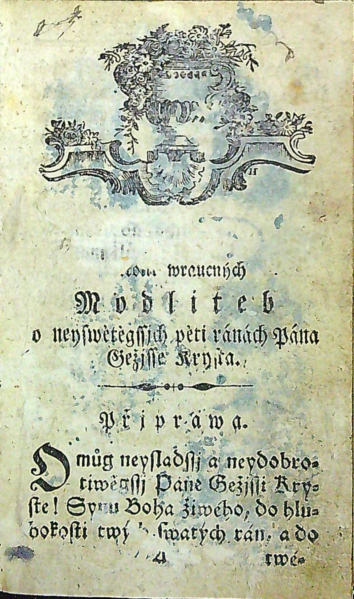 Pět čerwených Korálůw, to gest: Nábožné a vctiwé Autočjsstě k pěti předrahým Ránám (!) Pána Gežjsse Krysta, gakož také: Modlitby k neyswětěgssjmu Gménu Pána Gežjsse, k neyswětěgssj Trogicy. K nimžto přidáno pátnácte modliteb swaté Brygity, při mssi swaté, před a po přigjmánj welebné Swátosti oltářnj; modlitby s letanyemi za dussicky, gakož některé pjsně rannj y wečernj horliwé dussi k potěssenj. Pro osobu ženskau.