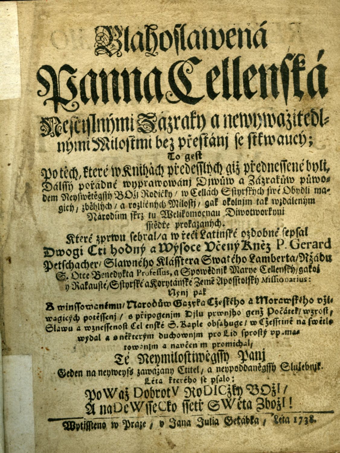 Blahoslawená Panna Cellenská Nescyslnými Zázraky a newywažitedl=nými Milostmi bez přestánj se stkwaucý; To gest Po těch, které w knihách předesslých giž přednessené byli, Dálssý pořádné wyprawowánj Djwůw a Zázrakůw půwo=dem Neyswětěgssý BOžj Rodičky / w Cellách Sstyrských swé Obydli ma=gicý, zběhlých / a rozličných Milostj /, gak okolnjm tak wzdáleným Národům skrz tu Welikomocnau Diwotworkyni sstědře prokazaných. ....