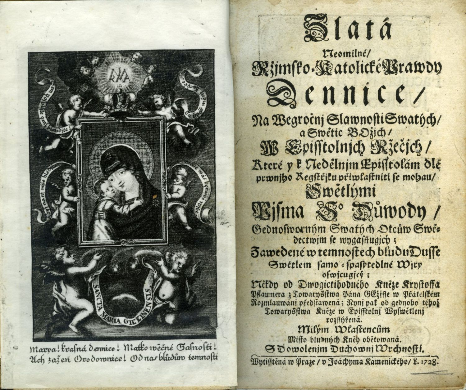 Knihopis 7117<br>Český text gotikou, latinský antikvou, signatury, stránkové kustody, arabské i římské číslování při horním vnějším okraji stran, živá záhlaví, viněty a vlysy rostlinného dekoru, obrysové iniciály s propleteným rostlinným dekorem a vstupní iniciála s Pannou Marií ve výši 4-6 řádků, plné iniciálky ve výši dvou řádků, ozdobné linky z lístků a kvítků, zvýrazněně tištěné nadpisy.<br>Mědiryt. front. a erb hrabat Šliků chybí - nahrazeny fotograf. faksimilií, před vlastním textem tištěná dedikace Antonína Koniáše Fr. J. Šlikovi a jeho manželce Anně Josefě Šlikové rozené hr. Krakovské z Kolovrat. Dobová vazba z hnědé hověziny, ve hřbetu čtyři vazy, vazba lehce ohmataná a odřená, jinak ve stavu dobrém.