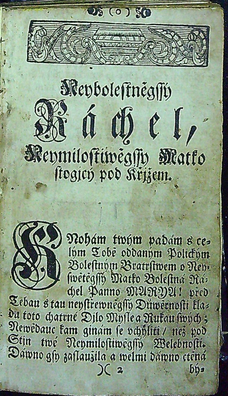 Hlas na Wýsosti Nařjkánj, Zalosti, a Pláče Ráchel Plačjcý Synůw swých. Aneb Knjha Bratrská/ K Potřebě a Vžitku Weleslawnoho Bratrstwa pod Tytulem Neyswětěgssý BOžj Rodičky a Bolestné Matky Panny MARYE Na Wýsosti Hory Kalwárské na Spůsob bolestné Ráchel pod Křjžem stogjcý, a wseech sobě poručených a pod Mateřskau Ochranu pod Křjžem přigatých Synůw a Dcer srdečně oplakáwagjcý, gako y v swého za Pokolenj Lidské na Křjži vmjragjcýho Synáčka za ně se přimlauwagjcý. W Klássterským Kostele na Nebe Wzetj Panenky Marye v Weleb. PP. Paterů Benedyktýnůw w Policy nad Methugi Léta 1592. začatédo/ Léta pak 1666. od Geho Swátosti Papežské Alexandra VII. potwrzreného/ a dne 8. Měsýce Zářj téhož Léta wyhlásseného. Sepsaná Od gednoho, Kněze Ržádu S. Otce Benedykta bSwobodného a Weyhradnjho Králowského Klásstera Břewnowského Professa, téhož Slawného Bratrswa někdy beywalýho P. Praesesa.
