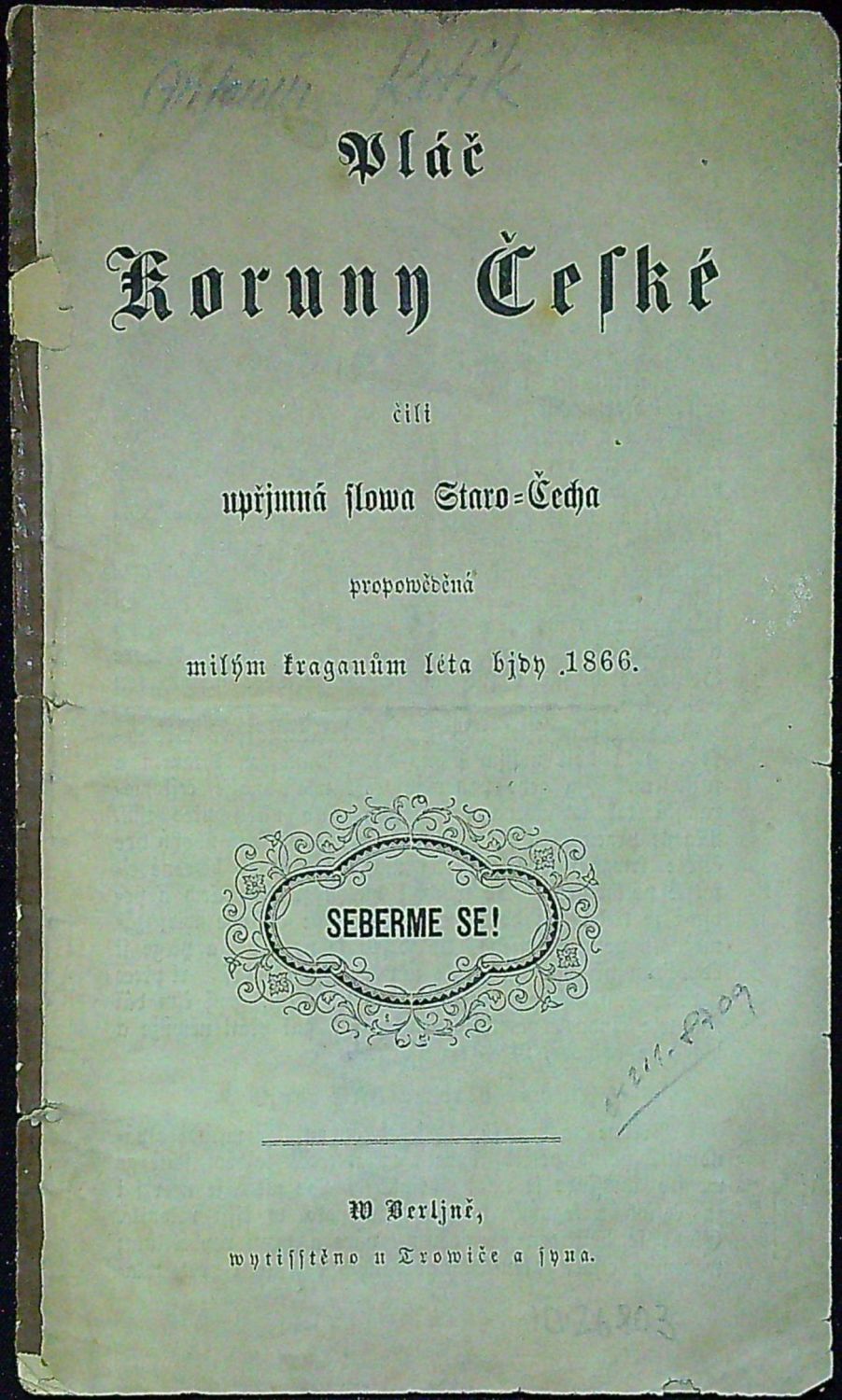 Pláč Koruny České čili upřjmná slowa Staro=Čecha propowěděná milým kraganům léta bjdy 1866.